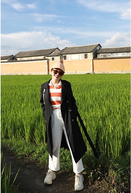 而時尚博主用西裝外套,搭配長款連衣裙,搭配的重點集中在了腰部位置,搭配了一款深色系腰帶,身材比例也劃分得很明顯。這種搭配方式就做到了轉移注意力,從而突出清晰的腰臀比,這種穿搭顯高效果非常明顯。