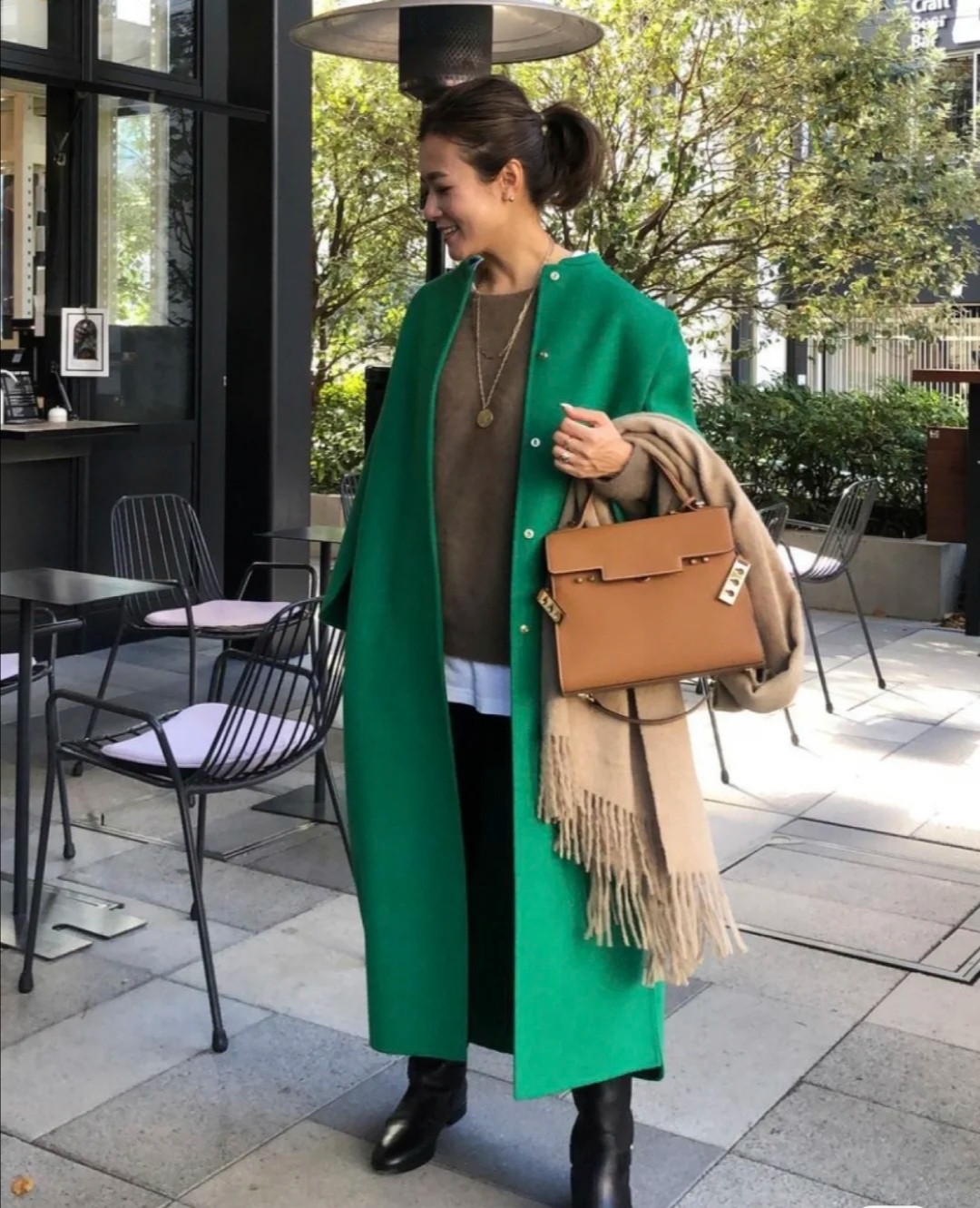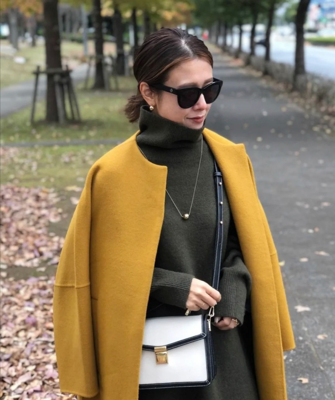 這套穿搭就會更加有氣質一點,但因為外套的選用比較亮眼,依然能具備活力感。內搭的選擇比較安全,深沉的顏色+高領的設計,保證暖意,保持舒適感。