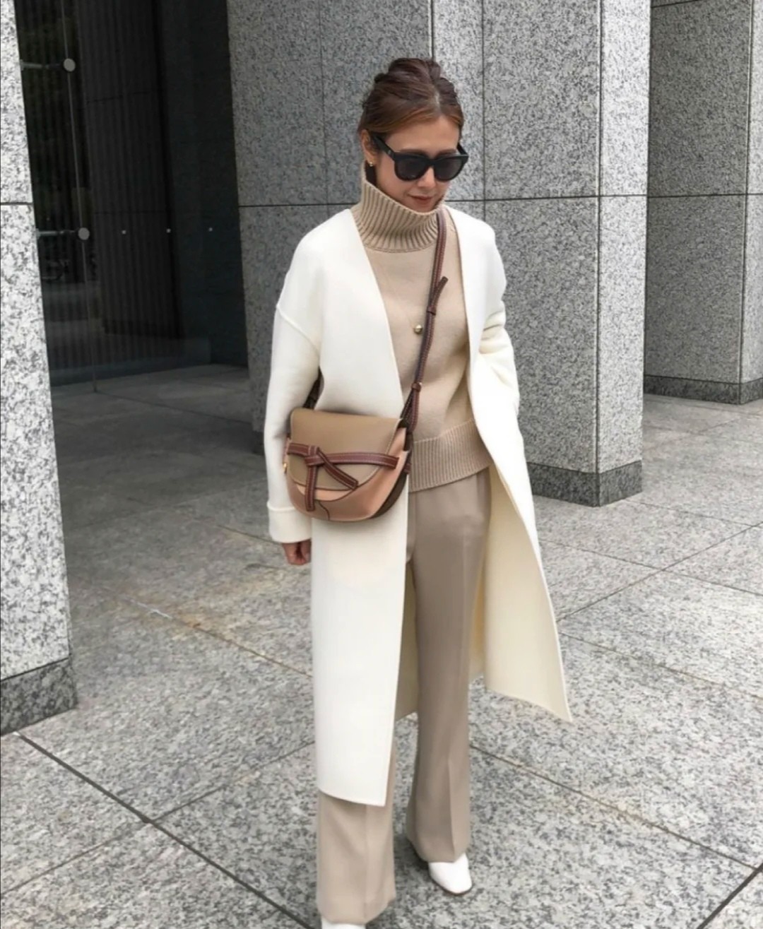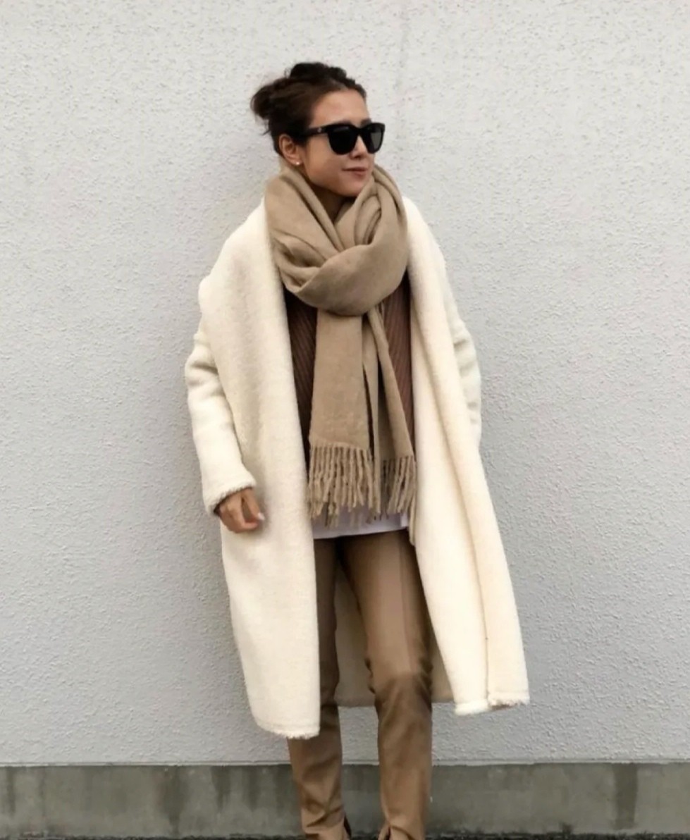 這款米白色的長款大衣,在顏色的運用上不會顯得深沉,也不會有老氣感,更不會產生出任何的裝嫩的風險,可以幫助五十歲左右的女性輕鬆構造出一套溫柔舒適又大方的穿搭。內搭的結合,可以採取各種大地色,包括圍巾也運用了這種色系,更為協調。