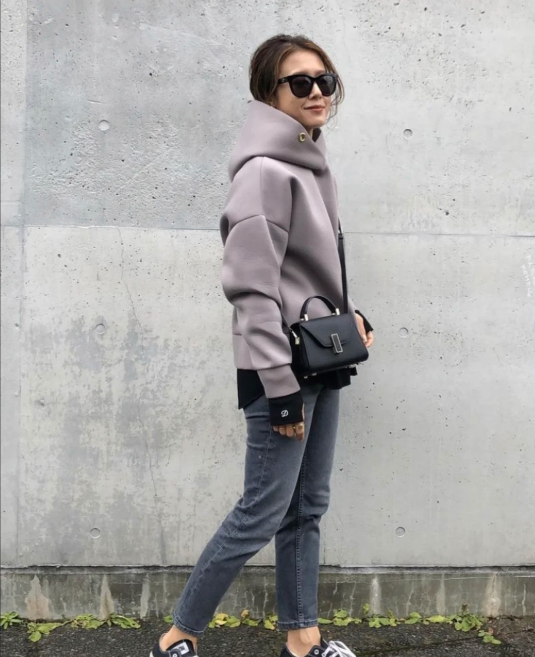 像這件連帽衛衣,它的短小設計可以方便女性穿起來更加利落。如果單穿它無法應對溫度的要求,可以直接外套大衣或者是沒有帽子銜接的棉服。