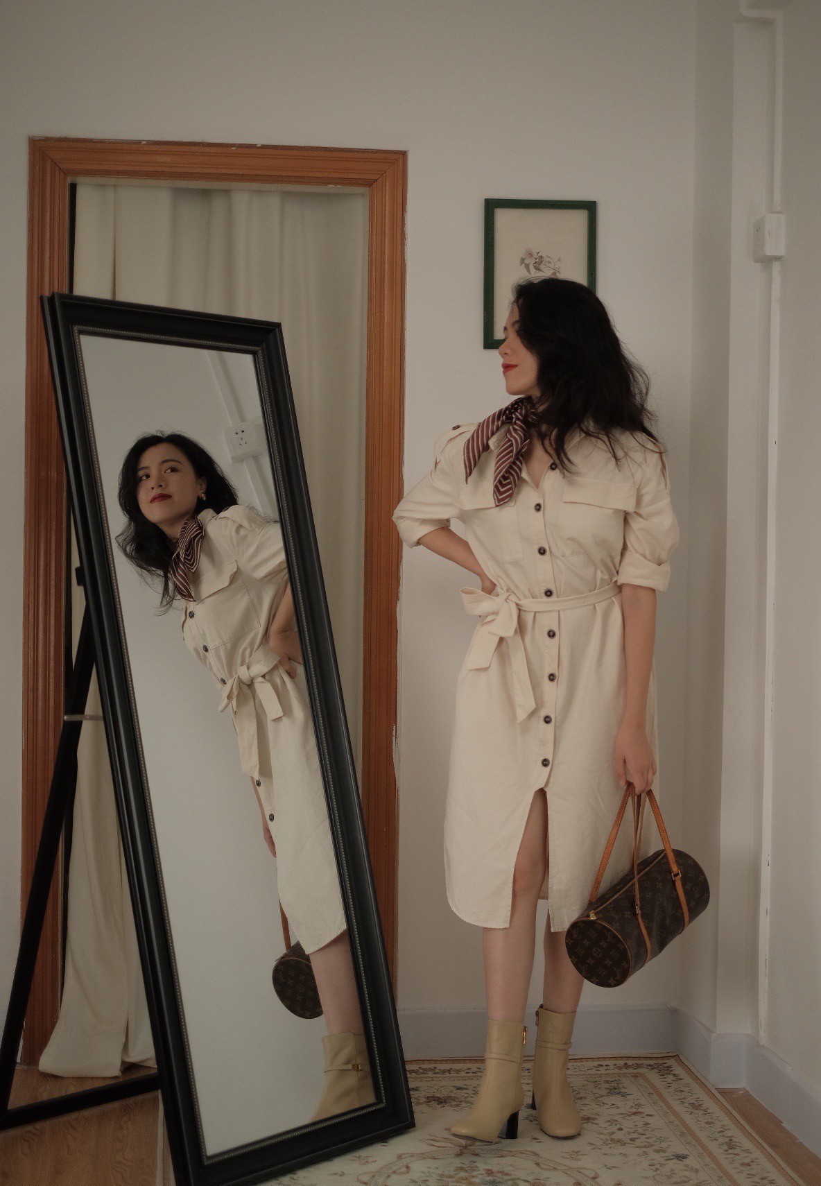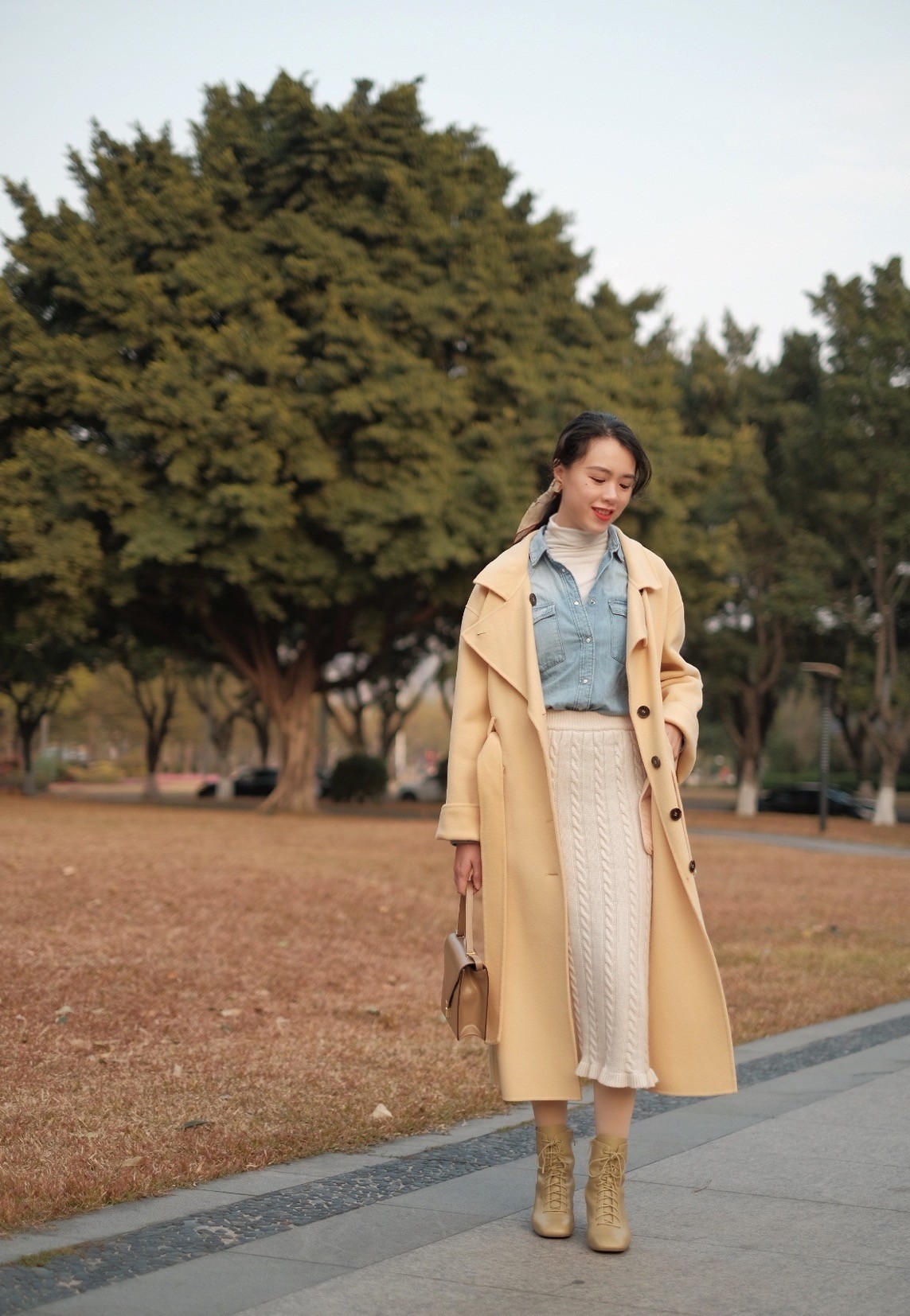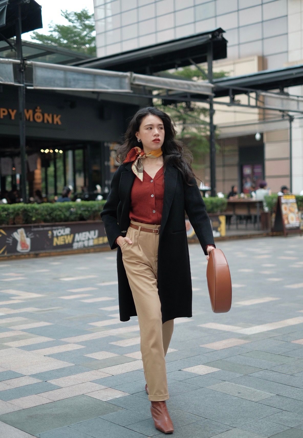 例如毛呢大衣,搭配一款半身裙,這種搭配方式女生味比較欠缺,但是搭配一款絲巾,把絲巾系在頭髮上,起到裝飾作用的同時,也增添了女性氣質。