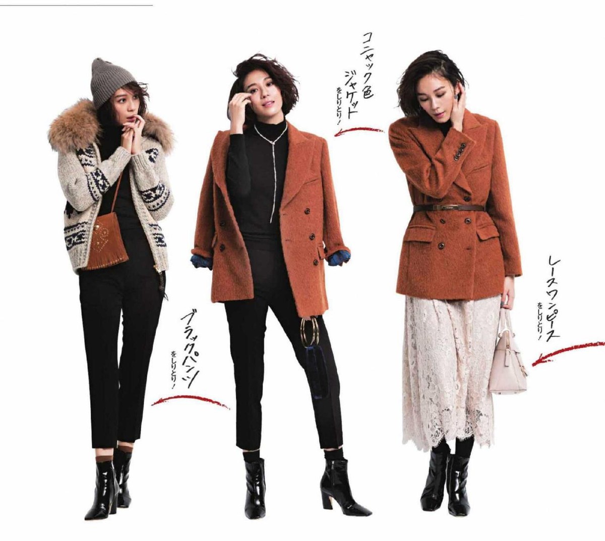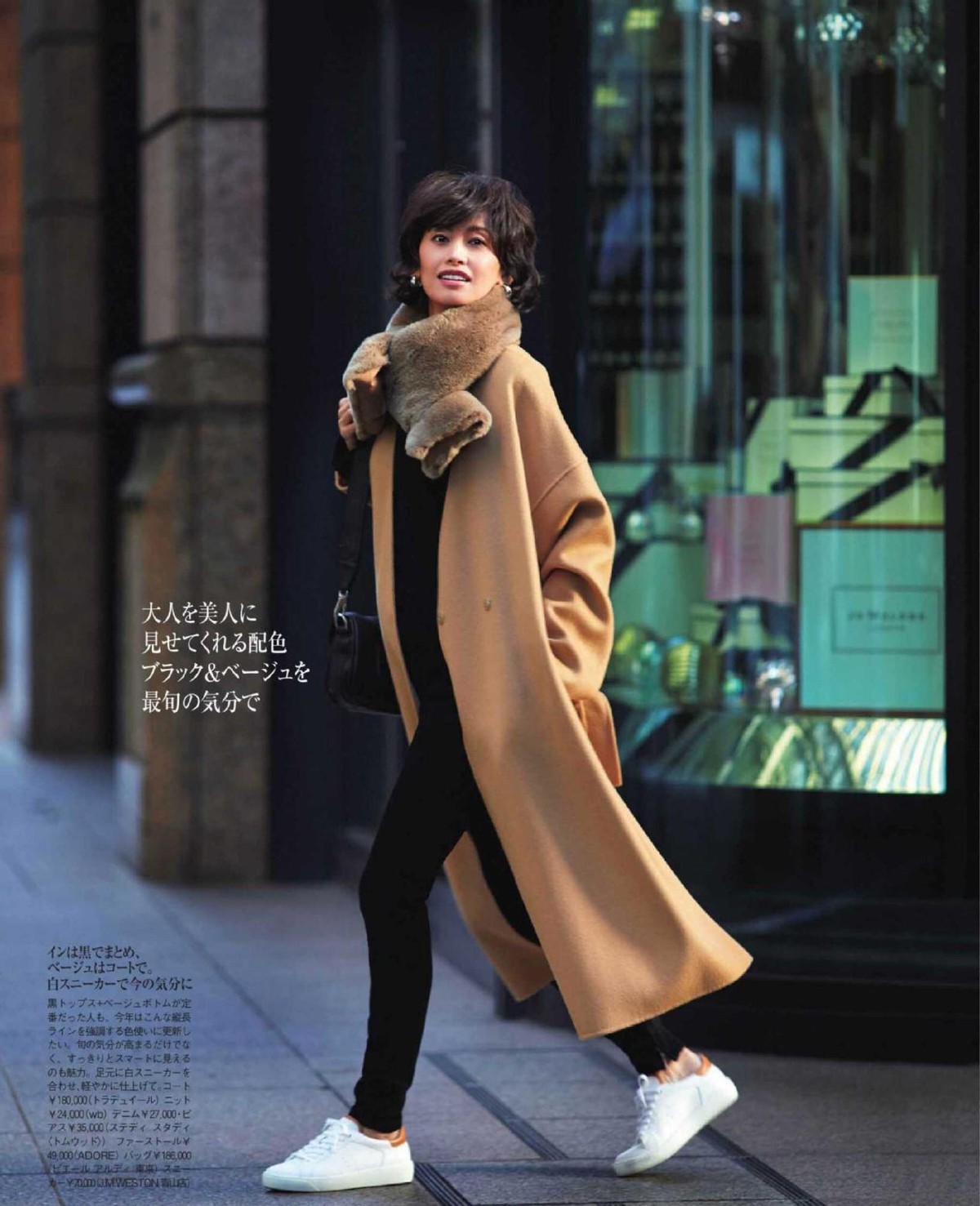 ·圍巾+駝色大衣+黑色小腳褲