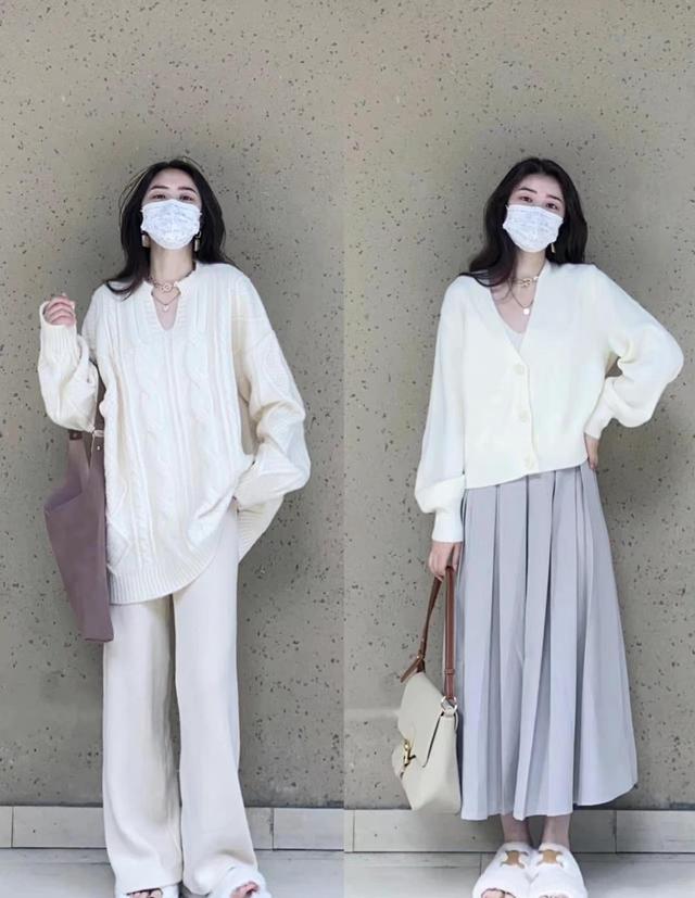 奶白色的寬鬆毛衣盡顯女生的溫柔神色,內搭輕薄的打底衫,隨性溫柔又甜美的韓系風。褲子的搭配也是一件米白色的寬鬆闊腿褲,一眼看過去,所有的溫柔盡收眼底。