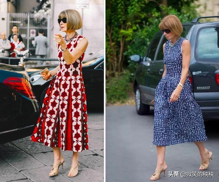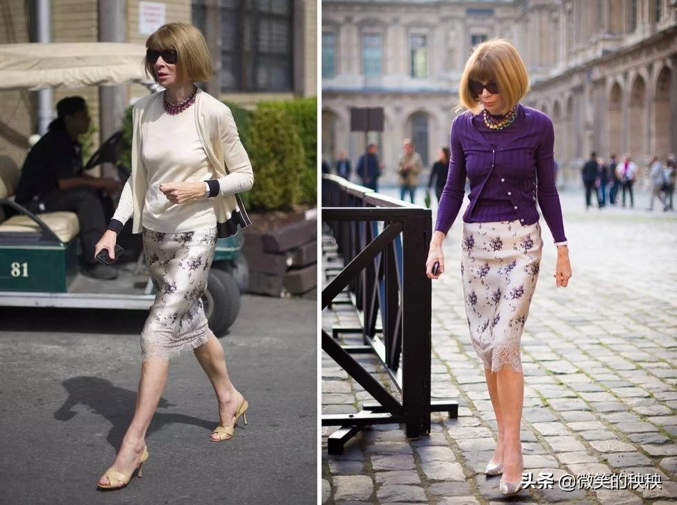 平時,在Anna Wintour的搭配中,基礎款出現的頻率也很高,像素色的針織上衣、幹練的半身裙、襯衫都時不時出現,有時,同一條裙子,換件上衣感覺就是一套新LOOK。