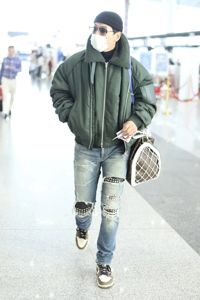 這款破洞牛仔褲更是典型的例子,褲管上一個個潮流感十足的破洞設計已經足夠抓人眼球,所以上衣不管是單薄還是厚實的棉服,款式簡約的時候造型效果會更好。