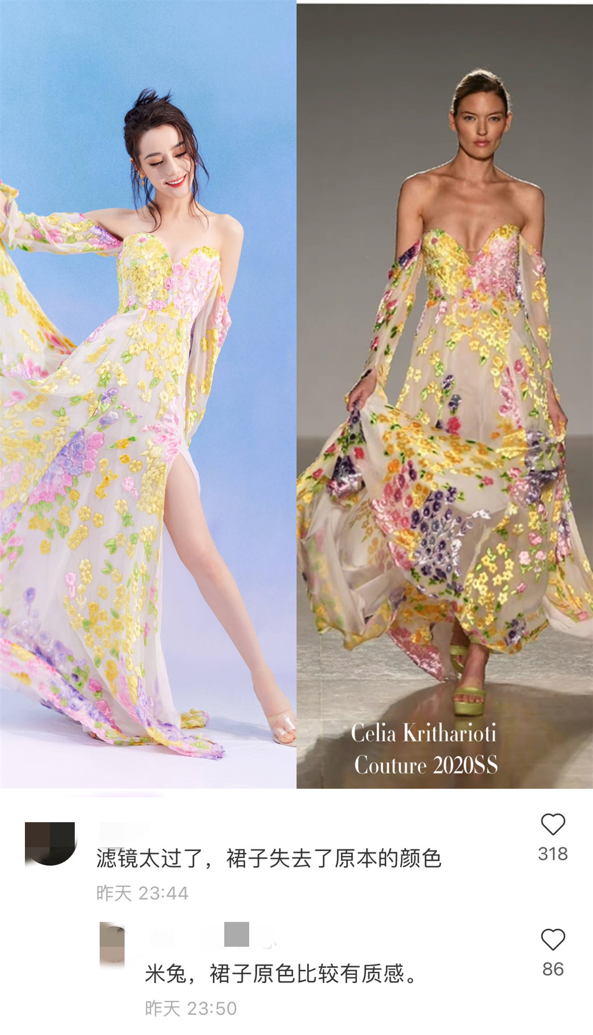對這個造型,網友們的爭議在於色差,不少吃瓜大眾覺得工作室精修圖打光濾鏡調得太亮了,對比T臺效果稍稍少了一些質感,對此你怎麼看?