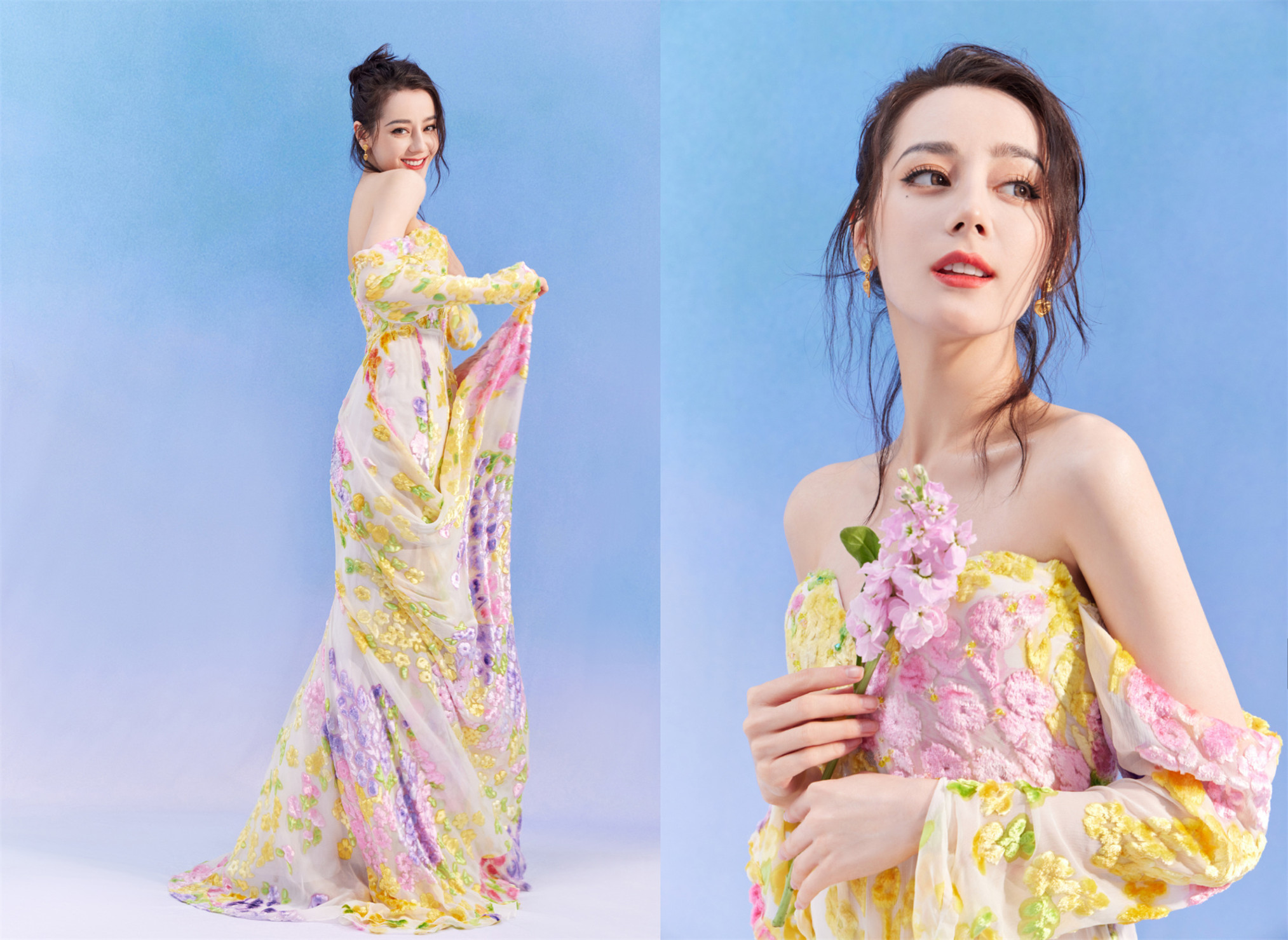 這件裙子來自Celia Kritharioti2020春季定制系列,裙子本身很漂亮,大面積的彩色花朵刺繡非常適合熱巴的異域感五官,輕盈柔和的薄紗也為她硬朗的線條增添幾分溫柔感,整體氣氛非常好。