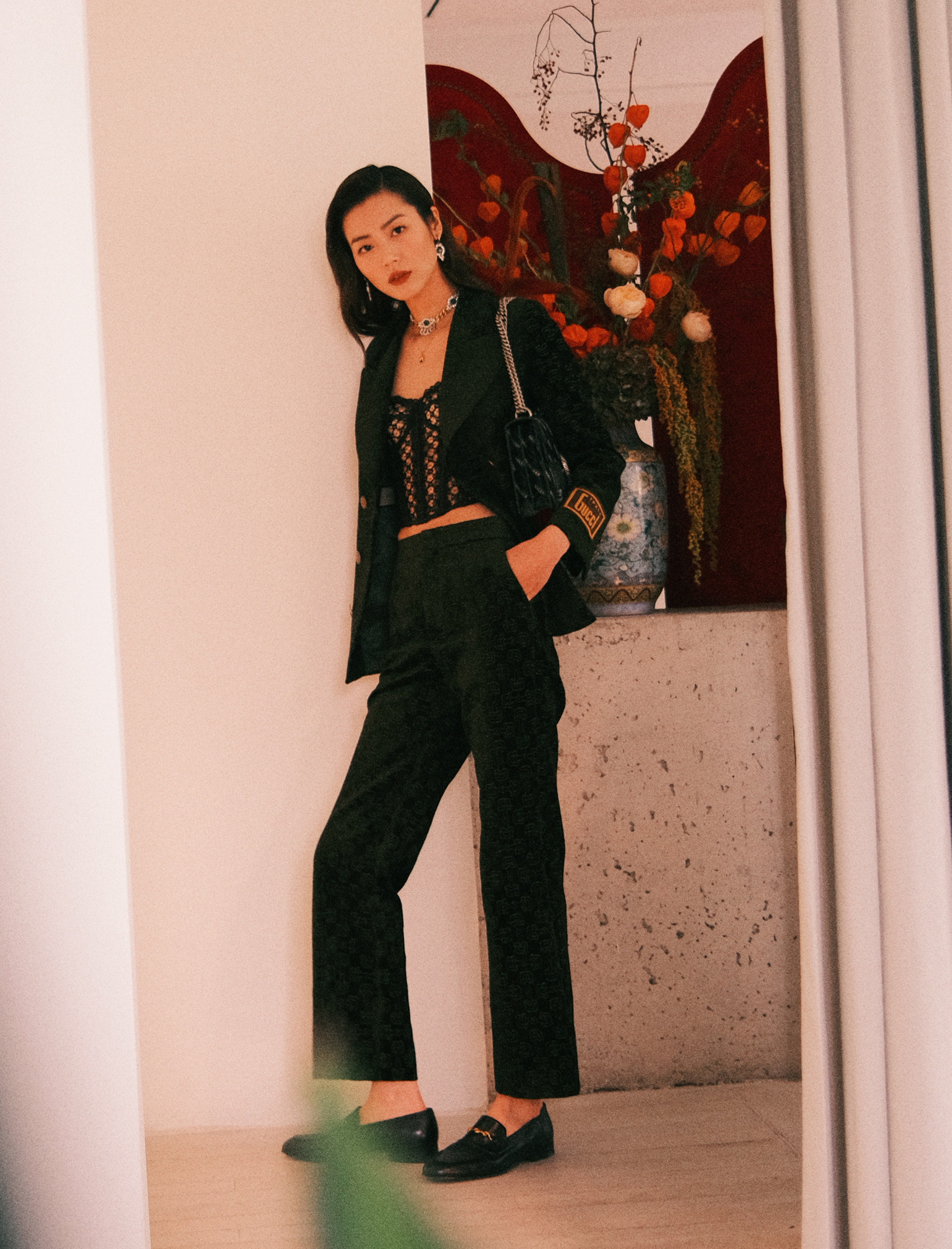 一套Gucci 100特別定制的墨綠色西裝,內搭Gucci2022初春系列的蕾絲胸衣,這一套造型娘man平衡,用輕薄的復古胸衣中和西裝的厚重與硬朗,為造型增添幾分性感味道又不會顯低俗廉價。