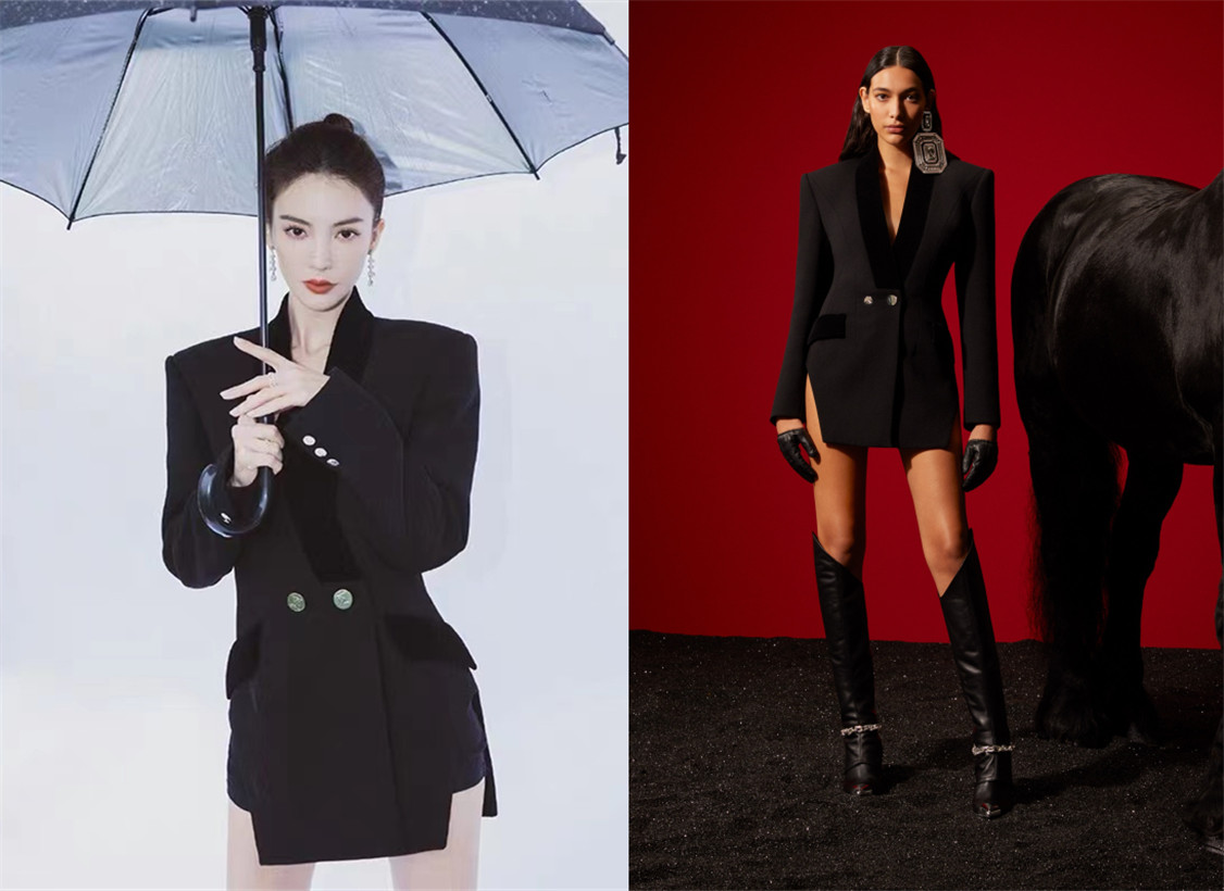 除了劉雯的這個思路之外,辛芷蕾的這一套也值得高冷辣妹學習。辣妹裙配黑絲高跟鞋非常容易低俗不高級,怎麼破?辛芷蕾同樣也是用一件西裝去化解,加上利落的髮型和金屬耳飾的點綴,整套造型又辣又高級,給人一種想邀請她跳舞但又不太敢靠近的感覺。