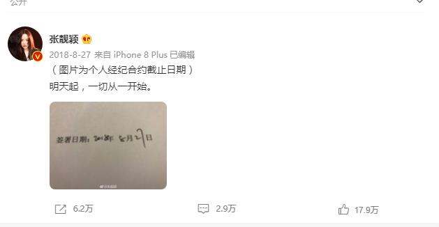 2018年8月27日,張靚穎在微博曬出一章合約簽署的圖,正式宣布和少城時代解約,也側面宣告自己的婚姻結束。