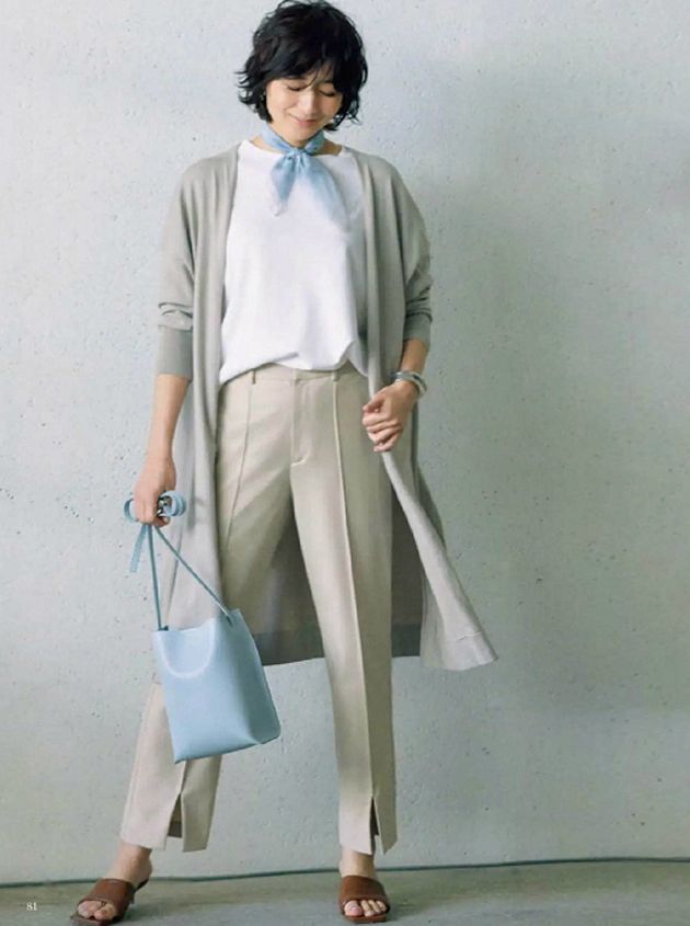 灰色針織開衫內搭白色T恤,下身搭配米色直筒褲和棕色涼鞋,加持霧霾藍色包包和絲巾點綴,提亮視覺又襯托膚色。
