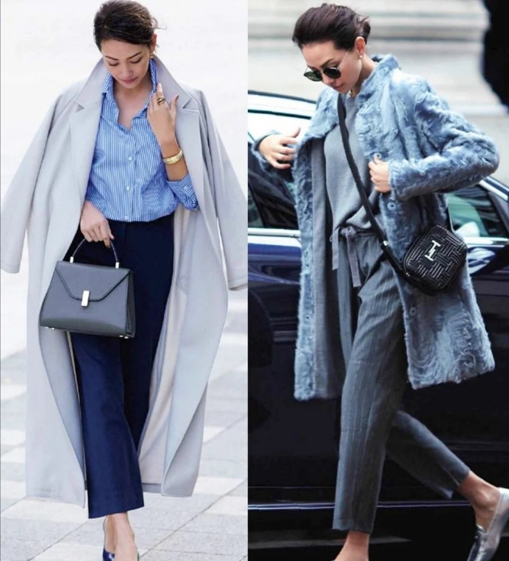藍色其實也可以位列其中,只是藍色的色調不應該過分鮮亮,而是要盡量地採用柔和的、低調的藍色為主,盡量加入一點深色的底色,這可以讓女性的穿搭更加簡潔大氣。尤其是霧霾藍色這類色調,它能作為外套使用,增加大氣美。