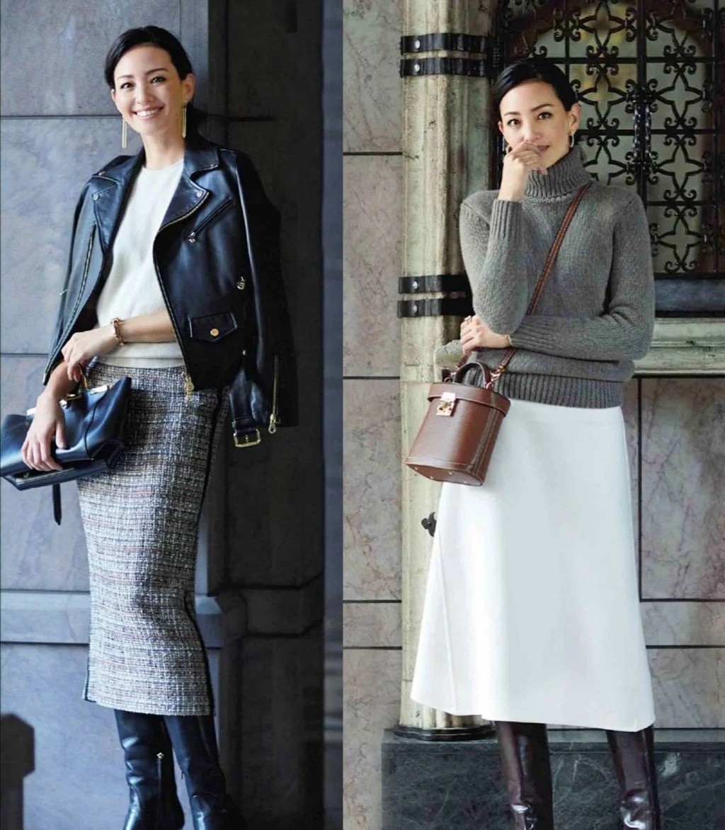 半身裙會比褲裝更能夠凸顯出優雅的氣氛,例如Rina身上的這兩款半身裙,它們對臀型的刻畫有所不同,左邊狹窄,右邊寬鬆,給你帶來不一樣的體驗。