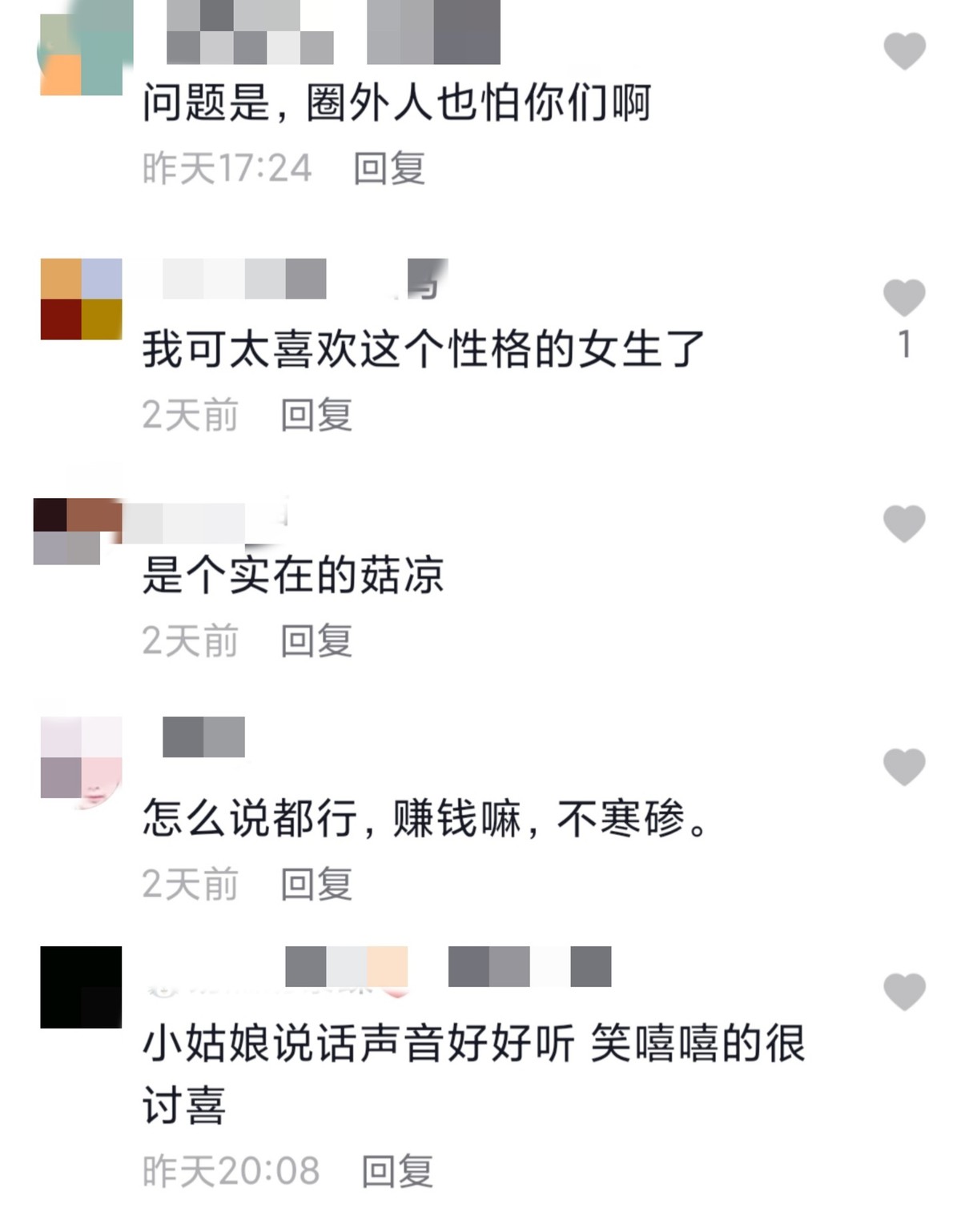 網友看了高晟瑤的採訪,有人直言非常喜歡這樣性格大方的女生,覺得她太實在了。還有網友覺得都只是為了賺錢而已,男生愛玩也可以理解。有一位網友表示能理解她不想找男演員的心,但問題是圈外的男生也怕她們這些在娛樂圈的女生。