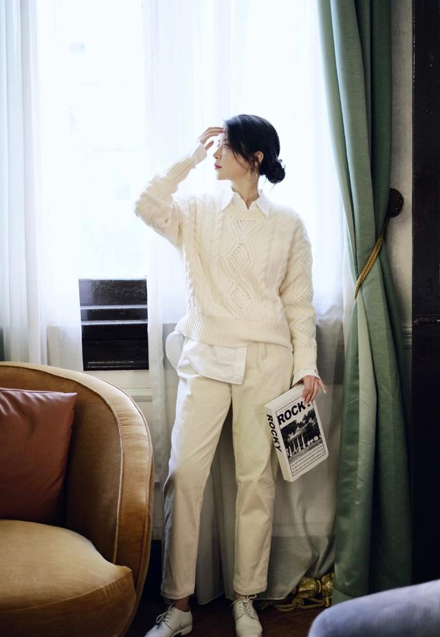 首先為大家分享最為簡單百搭的同色系疊穿搭配,如上圖中,三木時尚博主選擇簡潔的純白色毛衣與白色襯衣的疊穿,這樣的穿搭方式即使是穿搭小白們,也能夠輕鬆駕馭。下半身也是一條白色的褲子和白色的小皮鞋,雖然色調單一,卻由於服飾的質感不同,而自帶層次感,顯得文藝范十足。關鍵是,這樣的組合提亮膚色的效果極好,能夠穿出白皙透亮的好氣色。