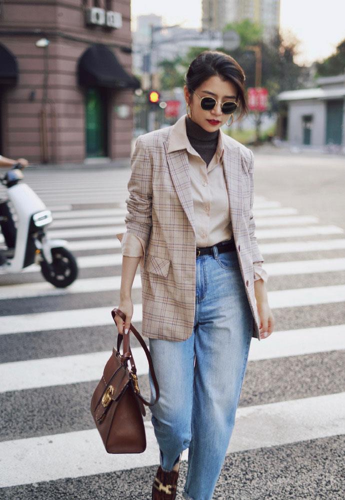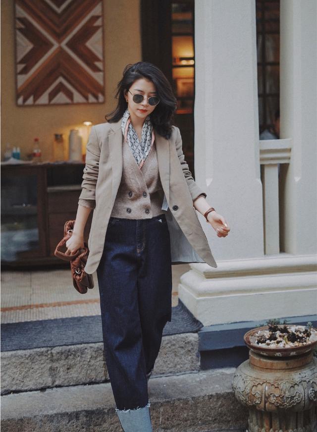 眾所周知,小西裝原來的搭配方式,會讓人不自覺感覺很有正式感、利落感,穿久了容易產生很嚴肅壓抑的氣氛,因此,今年秋季裡我們不妨學習三木博主的小西裝穿搭,利用同色系疊穿法來弱化,從而幫助自己增強整體造型時尚感和高級感。即使下半身搭配休閒風牛仔褲,也絲毫不擔心會影響你的形象,反而輕鬆自在了不少。