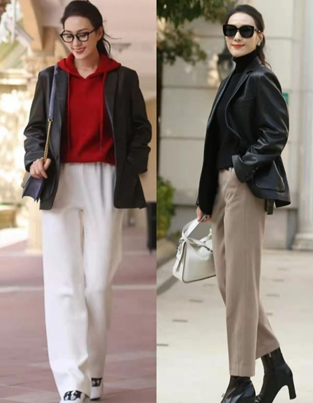 例如這款黑色的皮質西裝,穿在身上顯得瀟灑又迷人,寬大的版型不會帶來任何的拘束感,內搭黑色的高領針織,潮范十足又很顯氣場。結合紅色的連帽衛衣,與白色直筒長褲+運動鞋,更是將女性的慵懶與性感演繹得惟妙惟肖。