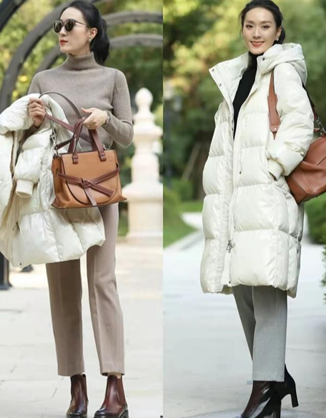 想要顯出身材的線條,可以採用上寬下窄的穿搭模式,既不會壓身高,又能穿出輕盈的感覺。或者將羽絨服敞開,露出好看的內搭,松緊的對比,顯出優美的身材。