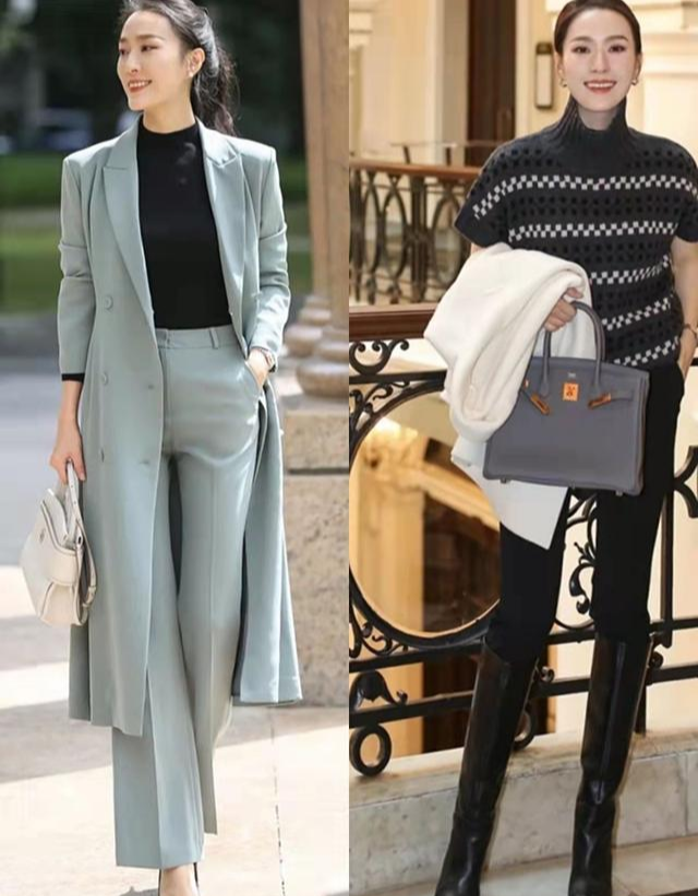淺綠色大衣內搭一款黑色的緊身針織衫,時髦幹練又不乏清新與溫柔,將針織衫塞進長褲中,並且採用敞開大衣的穿法,好身材盡顯,而且優雅又有氣質。