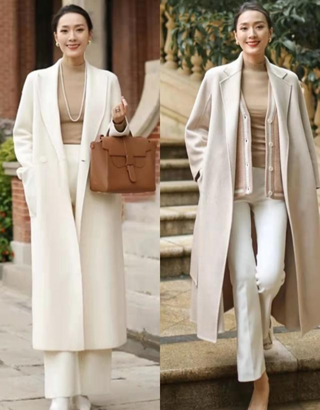 喜歡淡雅風的女性,內搭的顏色與大衣的顏色不要存在太大的色差,近似的顏色組合,對比度比較弱,營造的氣氛也會更加柔和。例如這款白色的長款大衣,內搭裸色緊身針織,一款長長的珍珠項鏈作為點綴,優雅大氣又顯高級。