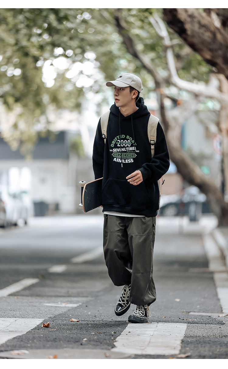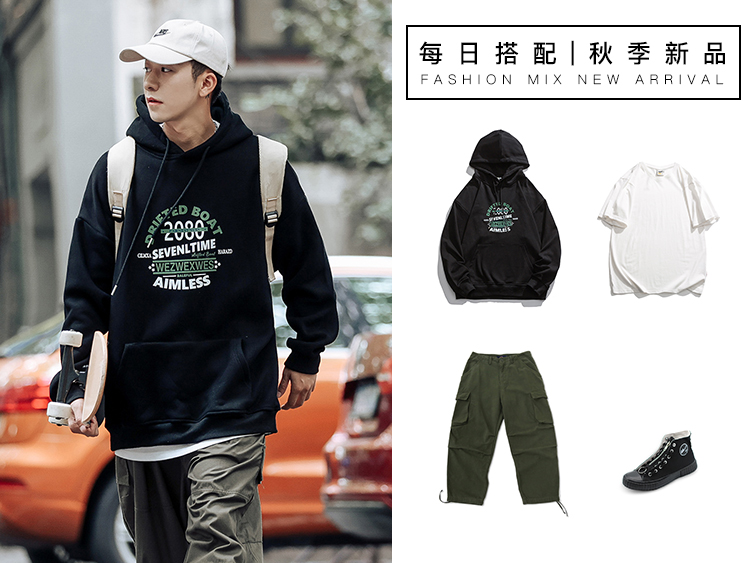 在日常穿搭裡,更多時候講究的是和諧、統一性,如果你追求花裡胡哨那可以忘記我前面說的那句話;話說回來,當你用對了色彩呼應法,穿搭會顯得自然又時尚!此搭配,上身選擇一款黑色連帽衛衣,胸前的個性印花,大膽的運用綠色+白色的配色,個性十足;內搭疊穿一款白色短袖,很好的呼應了印花裡的白色部分;下身選擇一款軍綠色工裝褲,巧妙的呼應了印花的綠色,褲型寬鬆適中,能夠輕鬆修飾腿部線條;鞋子選擇一款黑白撞色的高幫帆布鞋即可。