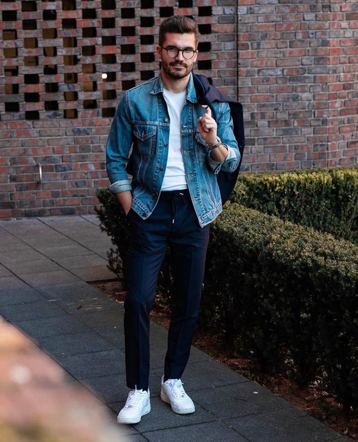 而在為牛仔夾克搭配下裝時,眼光也不必拘泥於相同的材質,同樣可以選擇風格、配色都略有差別的單品打造出多樣時尚效果。牛仔夾克往往是帶有硬挺感的,因此可以與寬鬆感十足的長褲來構成對比,強化休閒隨性氣息。