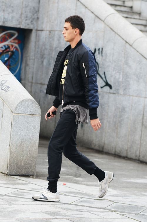 如果身材高挑,就可以嘗試一下略帶修身效果的運動長褲。飛行夾克的廓形衣身與修長褲身構成對比,打造出上寬下窄的既視感,讓造型看起來更有層次、更加豐富。