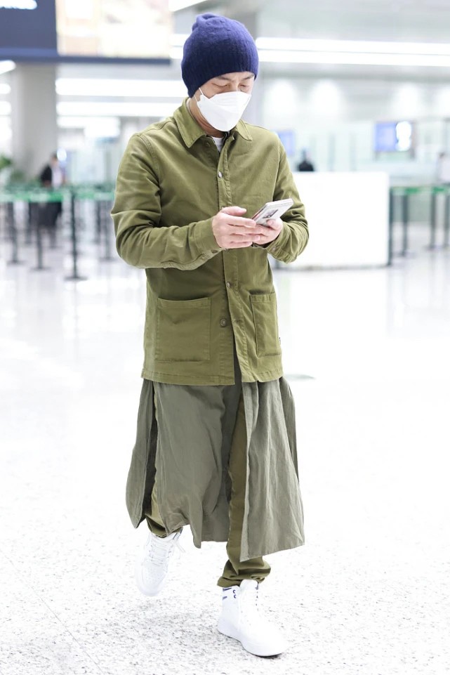 而整身搭配之中,最吸睛的還是長款內搭的選擇。軍綠色長紗配合開叉設計讓整體造型看起來飄逸感十足,同時也在視覺上帶來的延伸效果,顯得身姿更加修長。這樣的搭配方式可不是一般人能夠輕鬆駕馭,長短結合的穿法展現出獨特個性,也就張衛健這種時尚達人能夠hold住。