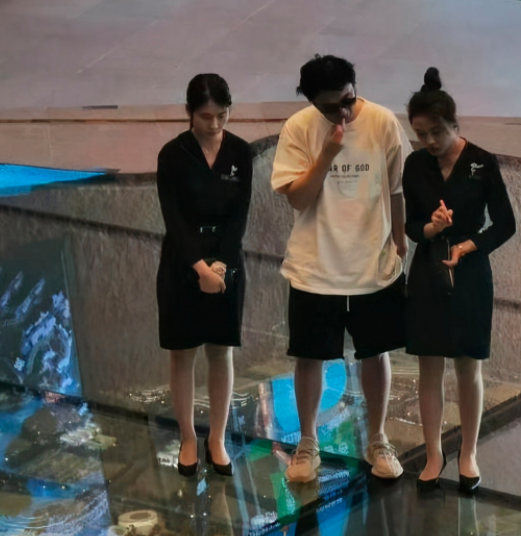 王思聰一路上被7個人簇擁前行:兩個迎賓男子,三個男性朋友,還有兩個長腿辣妹,女生都穿著超短裙,緊緊跟在王思聰身後,熟悉的網紅氣質。