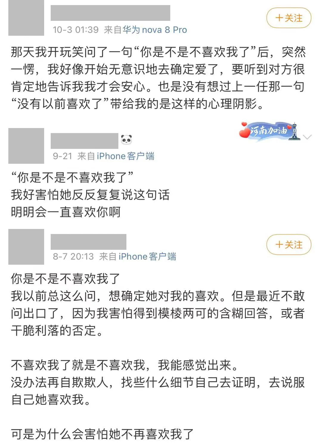 當我們不斷問對方:「你是不是不喜歡我了」,很大機率會發生和投稿同款故事。問的越多感情反而消耗的越多,本就所剩無幾的安全感再也不能通過對方的行動和回答補齊。