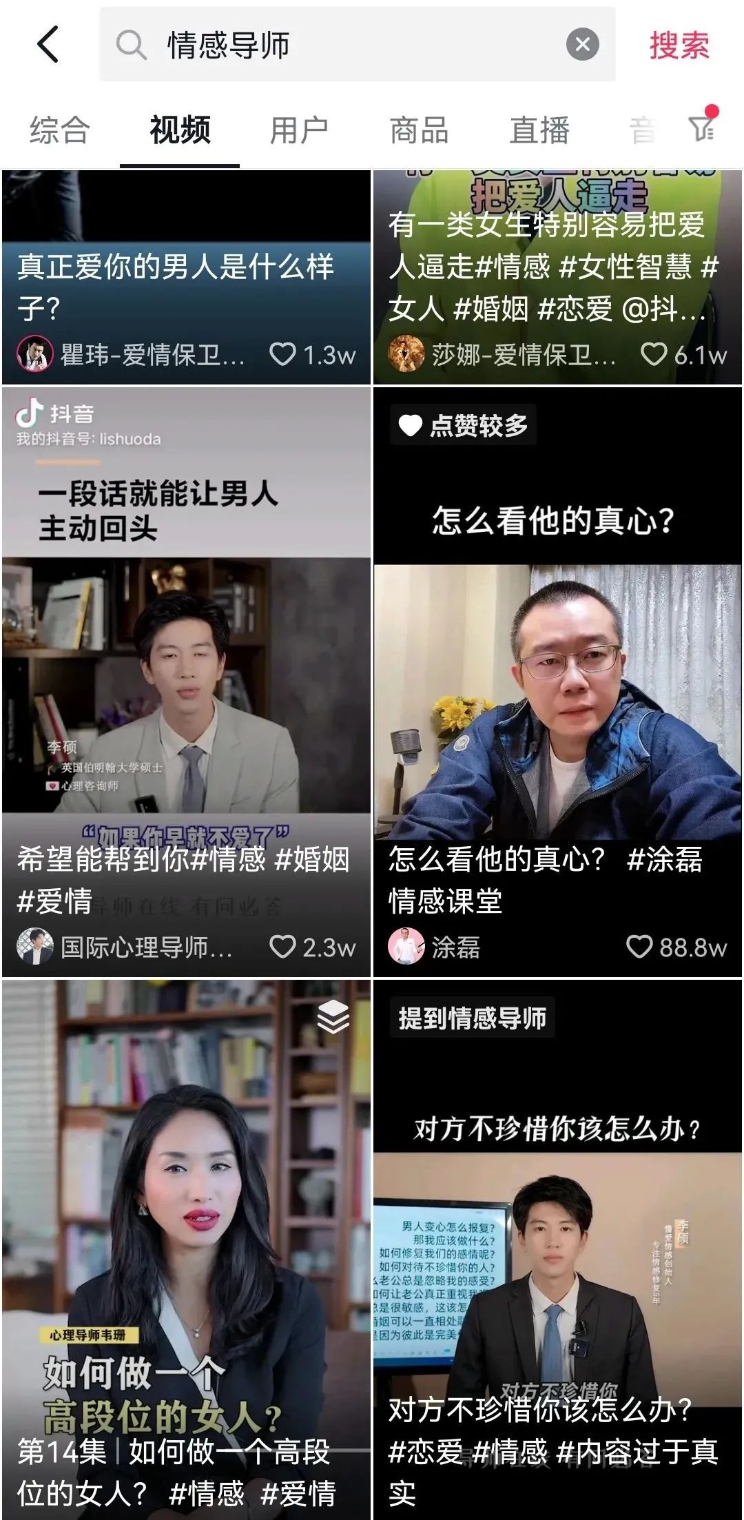 針對女性的情感視訊也同樣帶火了一批男性情感博主,這些博主往往以「為了女生不被騙」的立場,從男性角度給予女性戀愛、婚姻中的建議,如抖音上的情感博主「塵埃男友」(粉絲500w+)、快手主播清河李哥(粉絲1900w+)等,《愛情保衛戰》情感導師塗磊更是在抖音上有超過5000萬粉絲。
