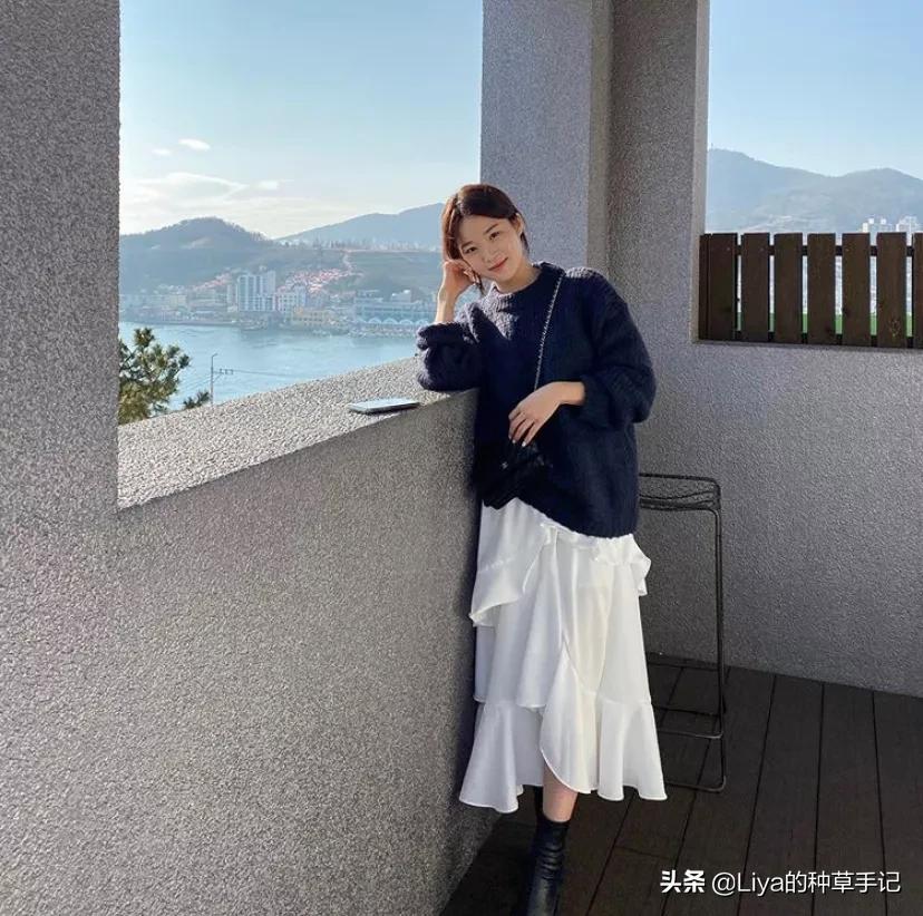 厚重的毛衣,輕盈的不規則半裙,剛好處於輕重平衡的臨界點,標準的混搭風的正確示范。