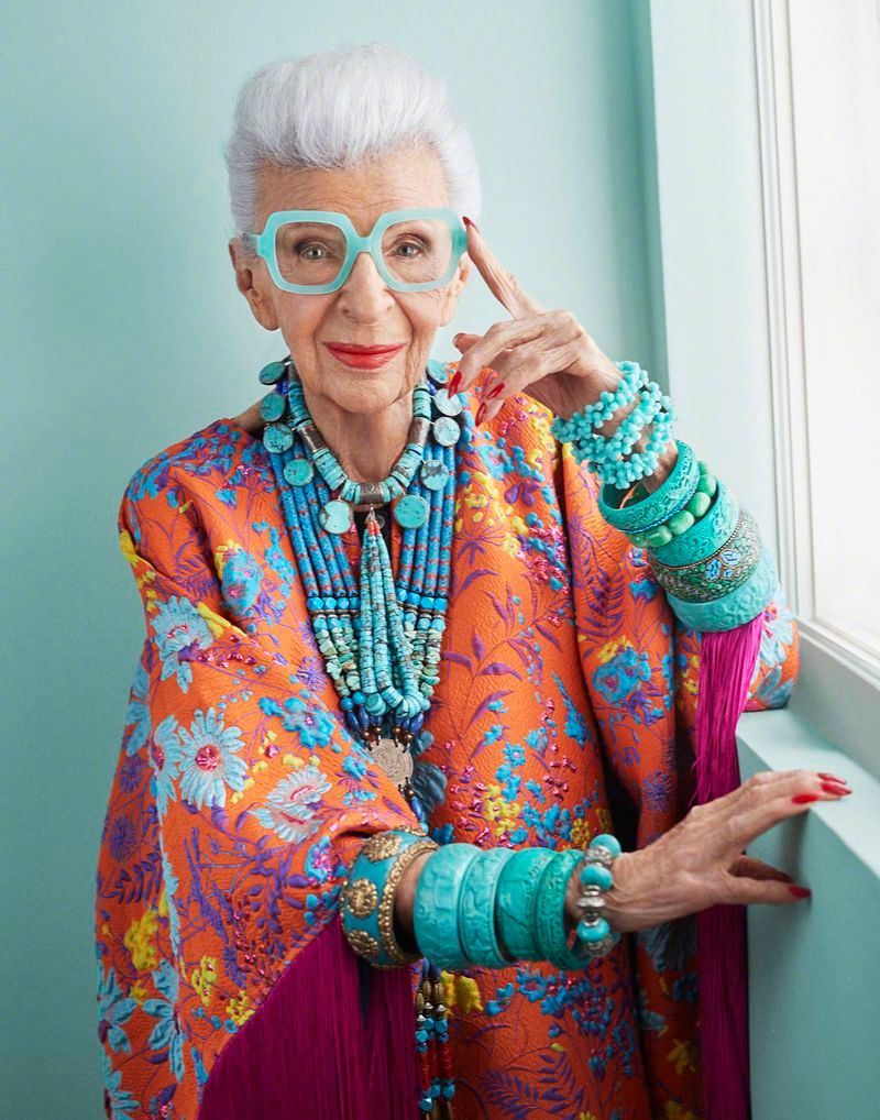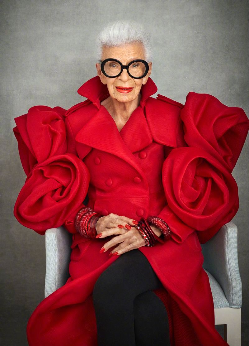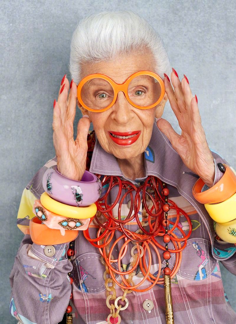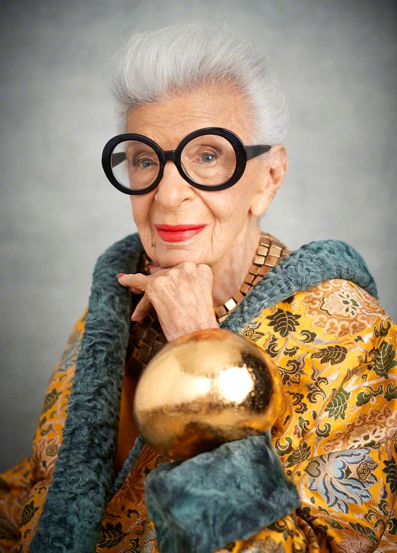 1921出生的艾瑞絲愛普菲爾Iris Apfel,已是一位高壽的百歲老人,她永遠認真打扮自己,對生命充滿熱愛,每一天都活得精彩又漂亮。在她的身上,會讓人完全忽視年齡的存在,她的裝扮華麗吸睛又很有趣味,她喜歡採用各種圓框眼鏡搭配復古混搭裝扮,現如今她已是全球年齡最大的時尚偶像。
