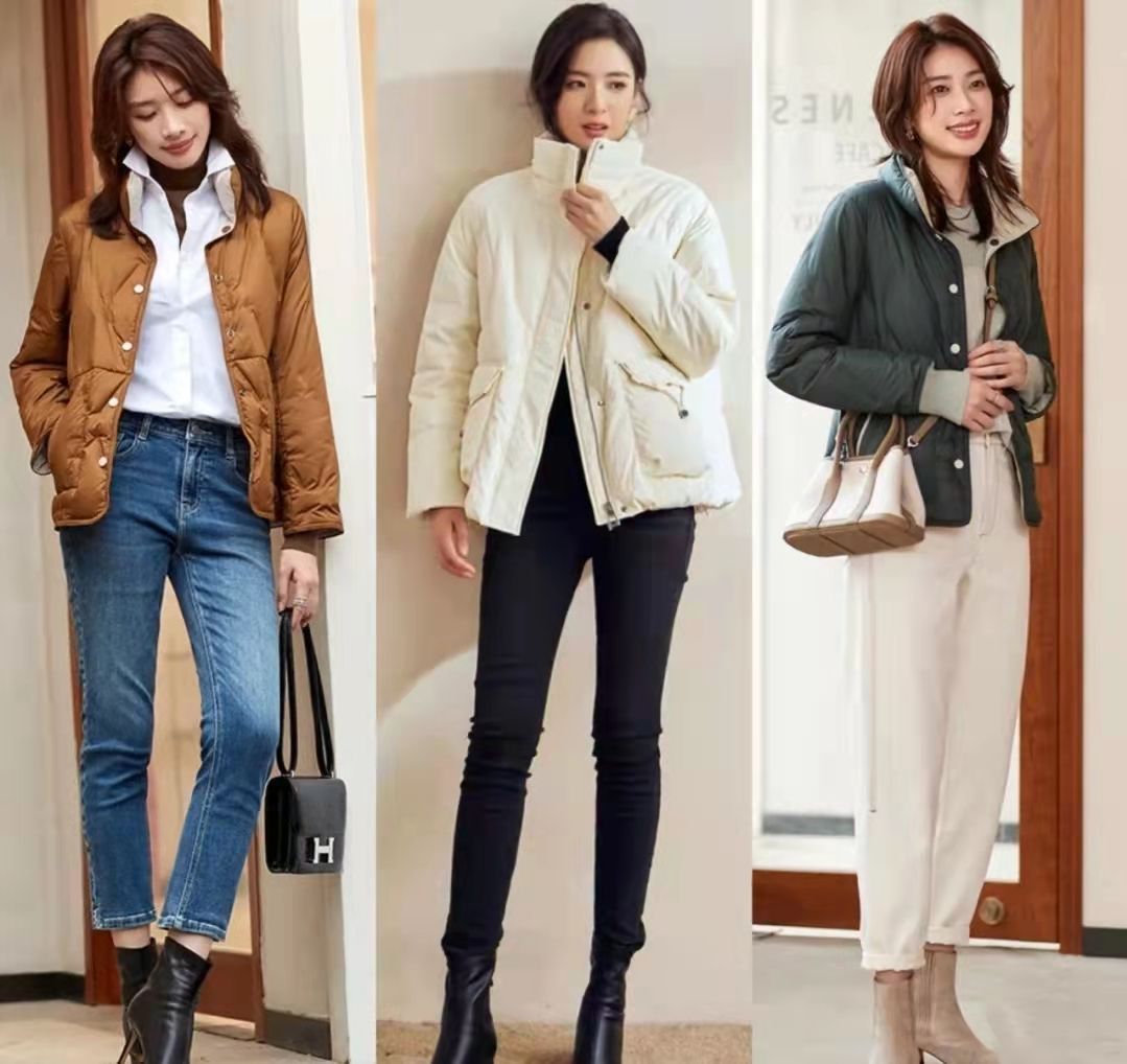 還有一類單品也很講究版型對比,即衣櫥必備款——羽絨服,無論是短款羽絨服還是長款羽絨服,組合小腳褲或者錐形褲,都比配闊腿褲更不挑人,是小個子可以直接借鏡的穿搭公式。