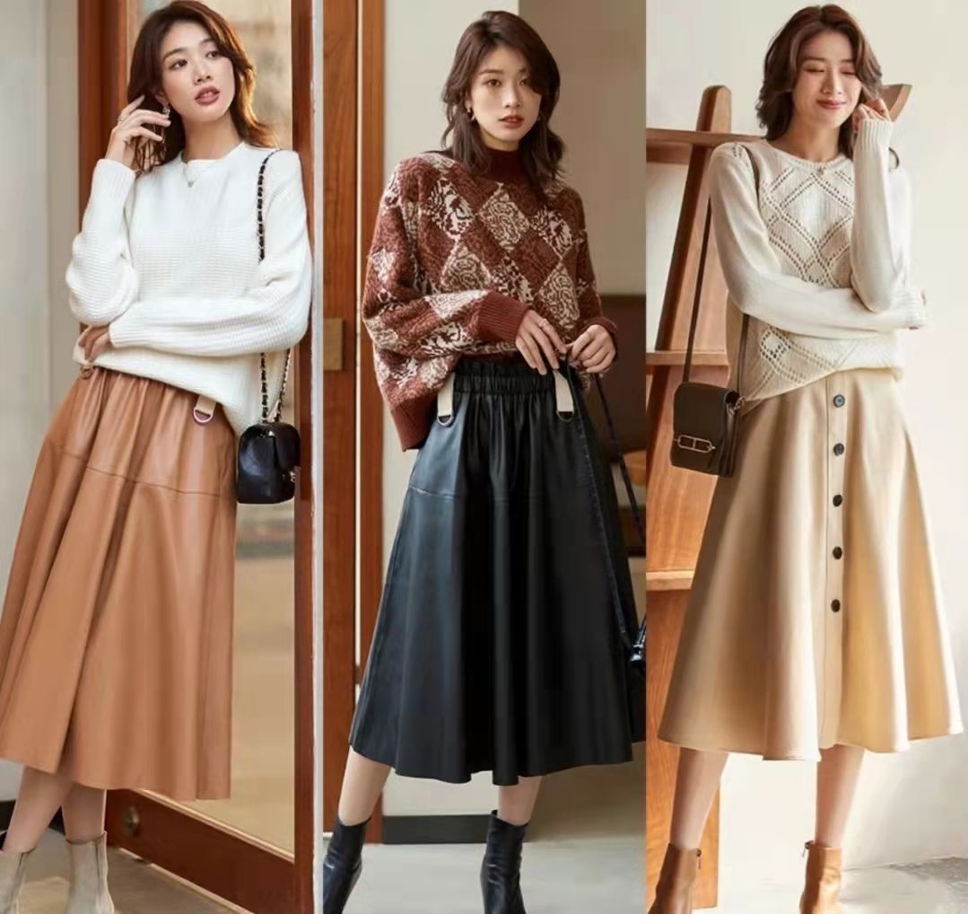 像奶茶色、奶油色、咖色、棕色或者黑色過膝裙,組合毛衣、大衣或者羊羔毛短外套,浪漫輕盈。