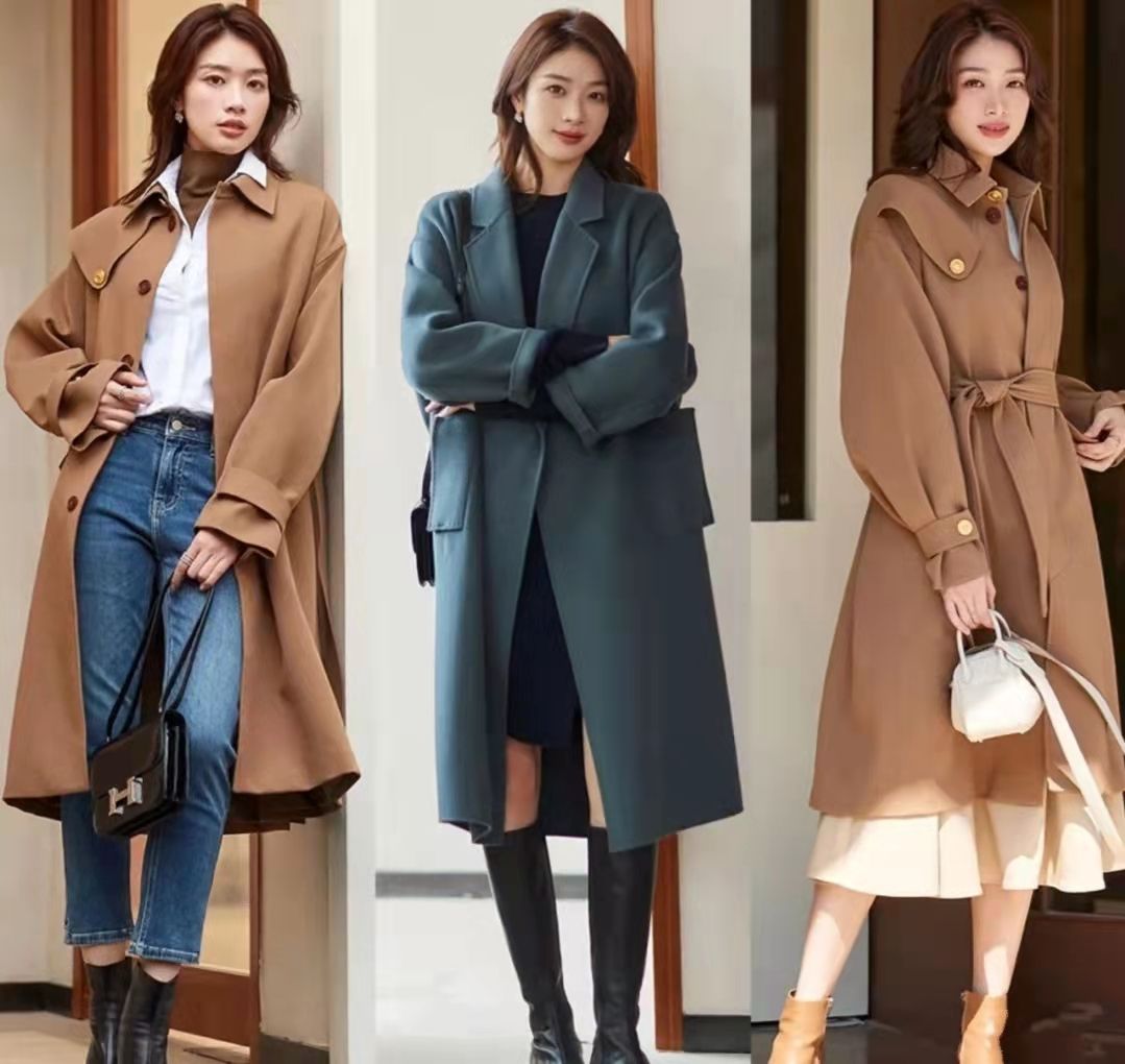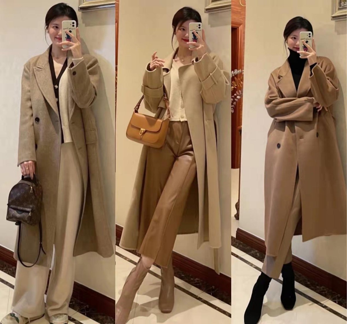 這裡有個細節要注意,內搭下裝採用同色系搭法時,顏色最好比大衣淺一點,例如用駝色大衣配米色打底衫,乾淨高級。