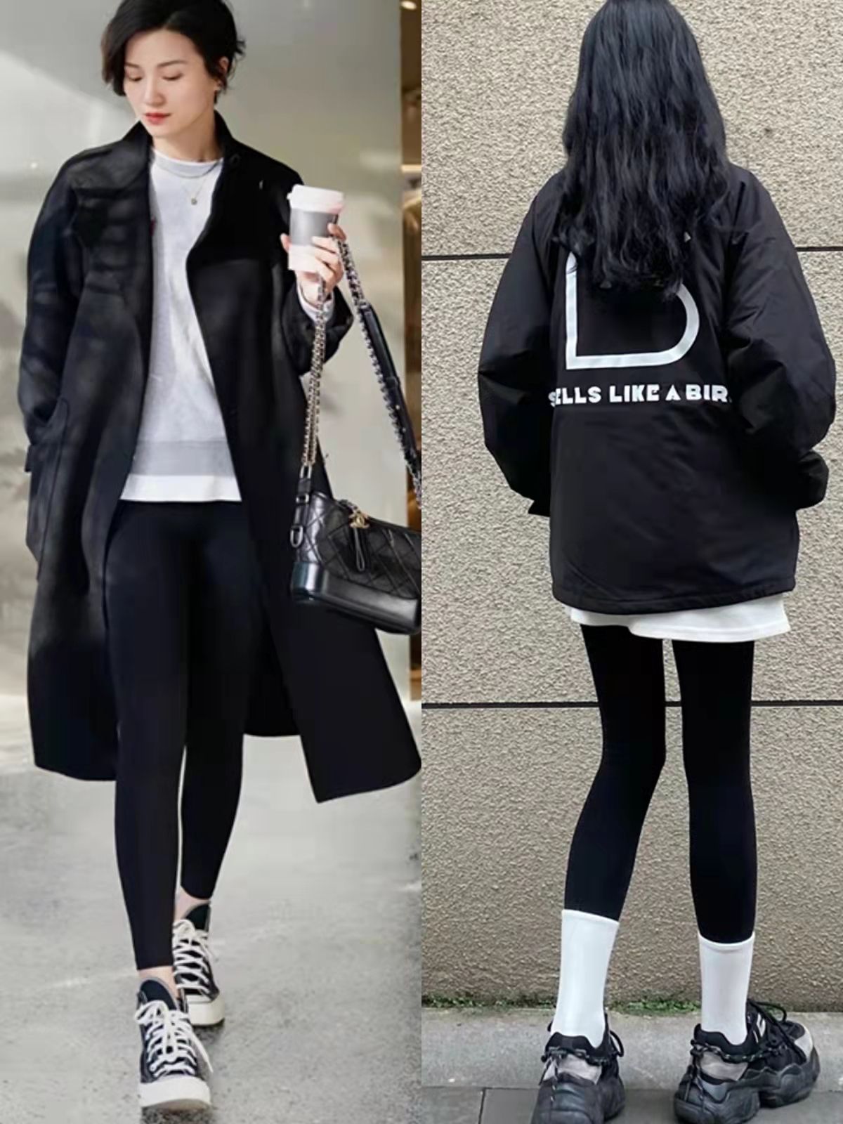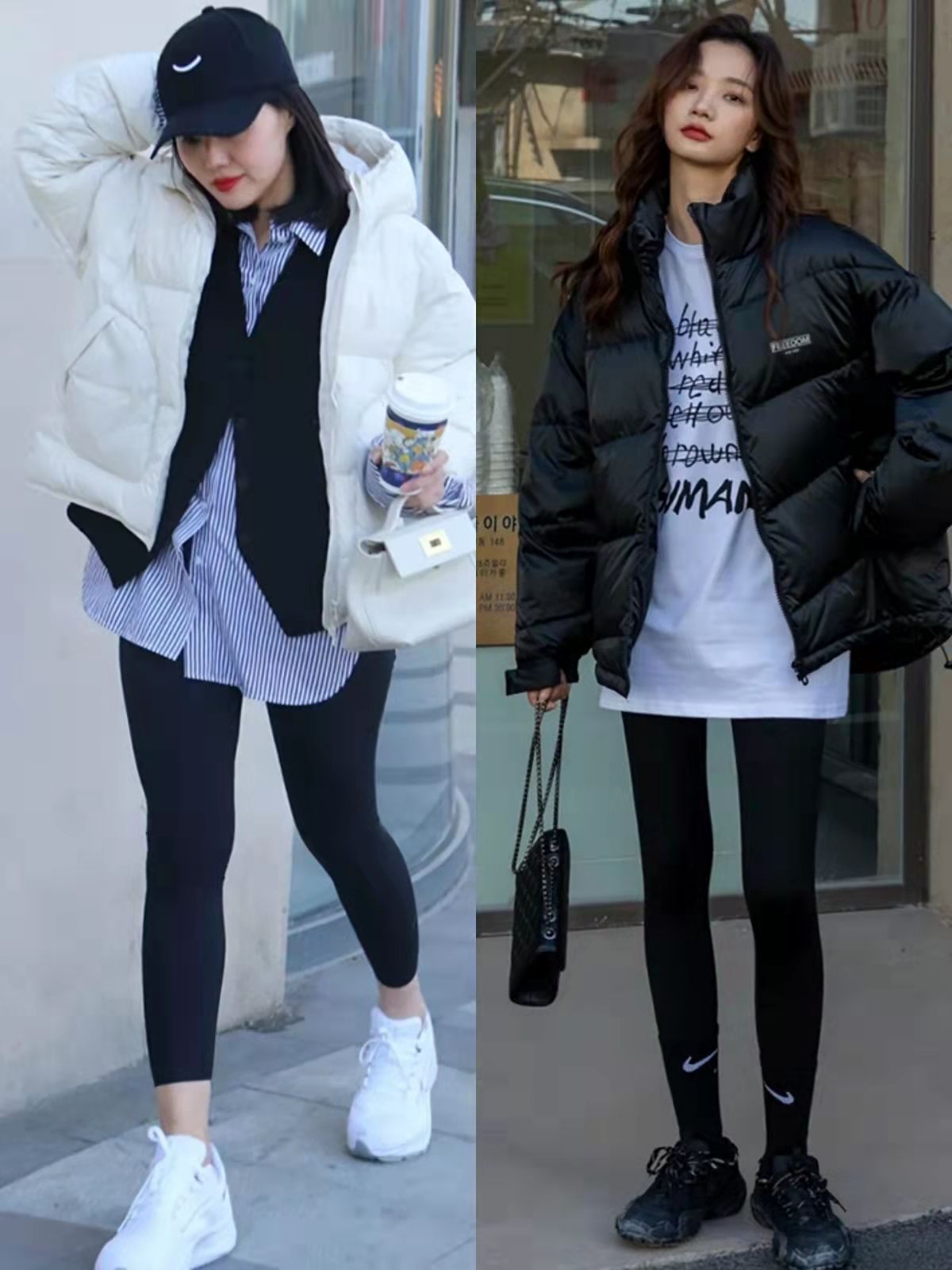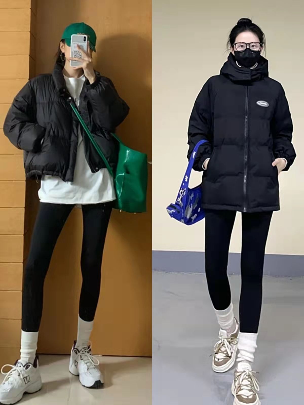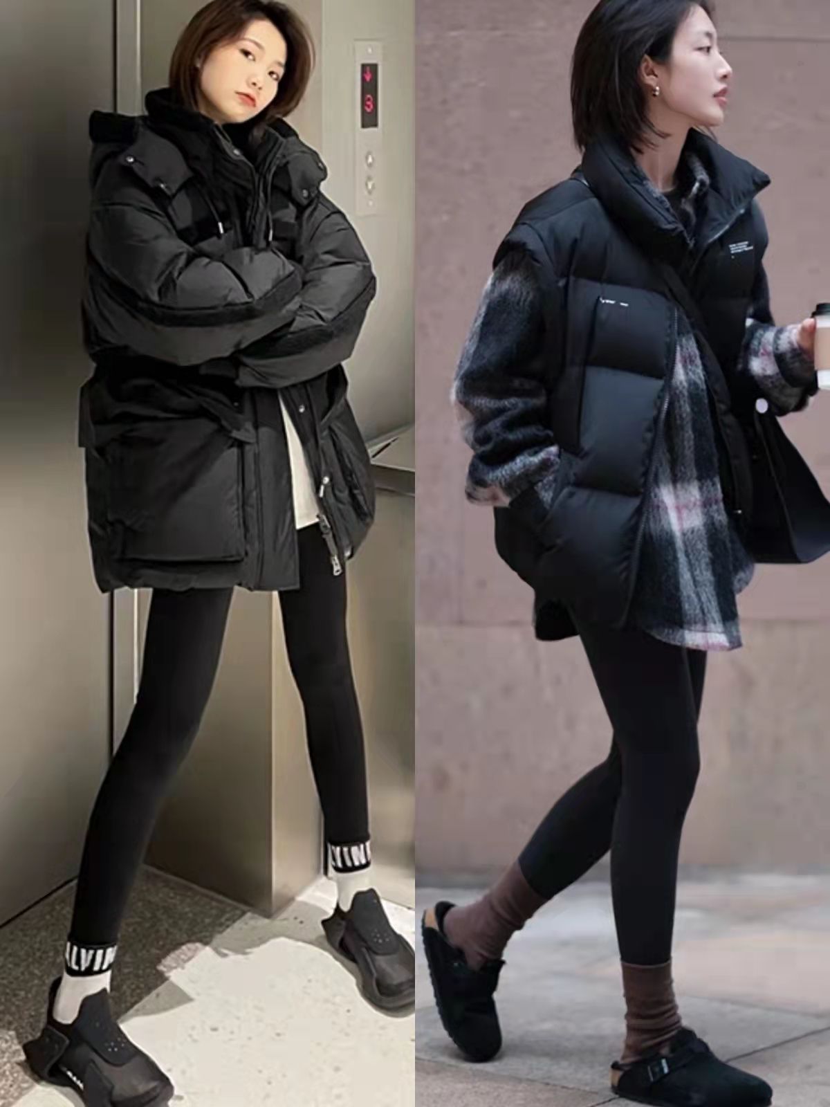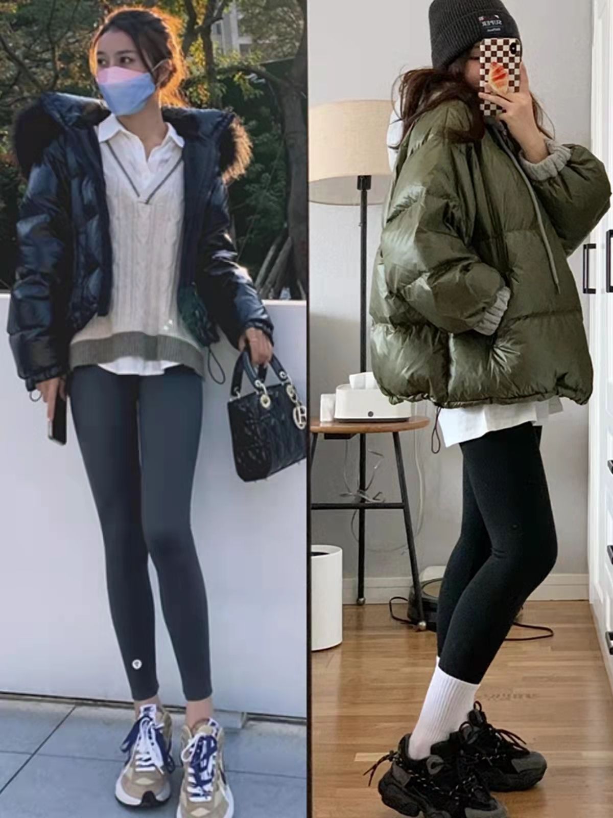 短款羽絨服+鯊魚褲的穿搭模式更利落時髦,二三十歲可以穿,四五十歲也能借助它來減齡,但這種搭法並不能遮擋腿部線條,不建議腿彎星人嘗試。