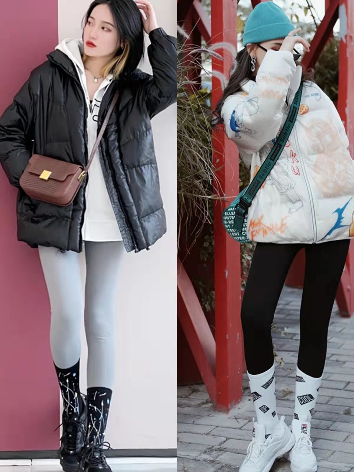 採用羽絨服與鯊魚褲、老爹鞋這一組合時,大眾在襪子選擇上比較固定,大多以黑色、白色為主。