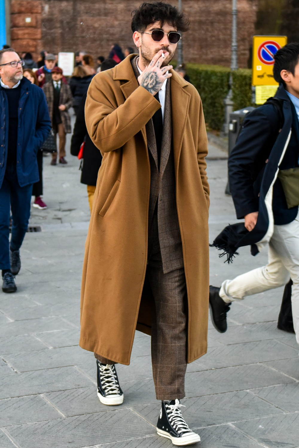 牛角扣卡其色大衣配上帆布鞋,減齡效果也是很出眾的。大衣的版型很簡約,以直線條打造輪廓感,與帆布鞋的青春活力感相呼應,造型風格非常協調統一。