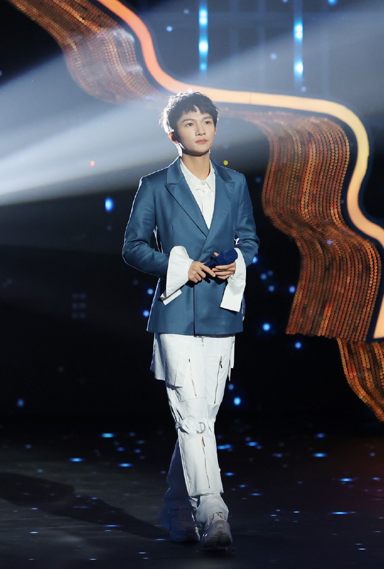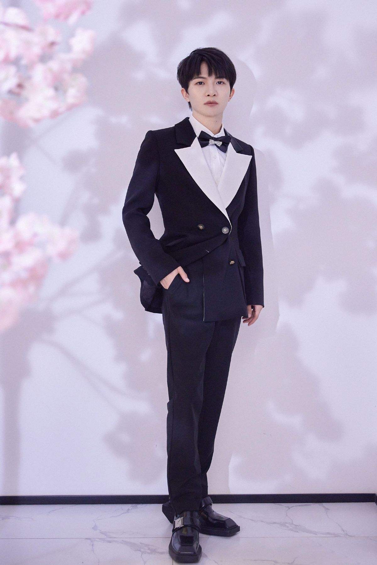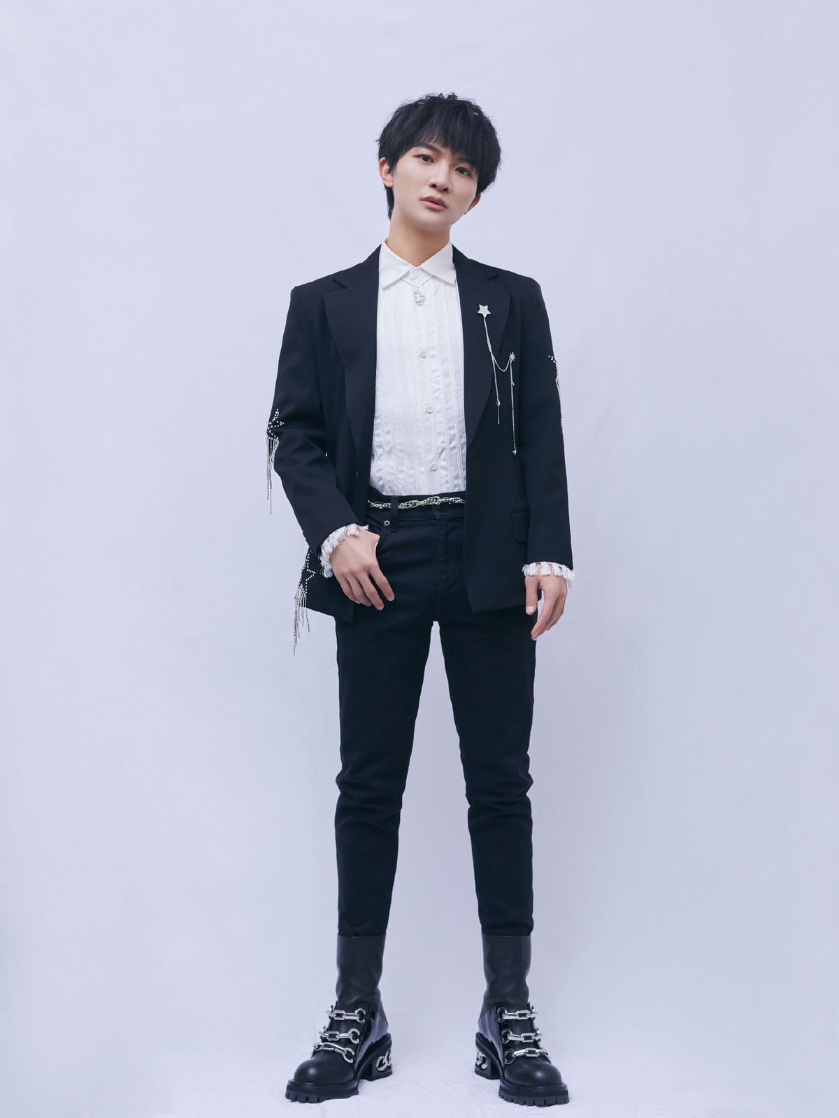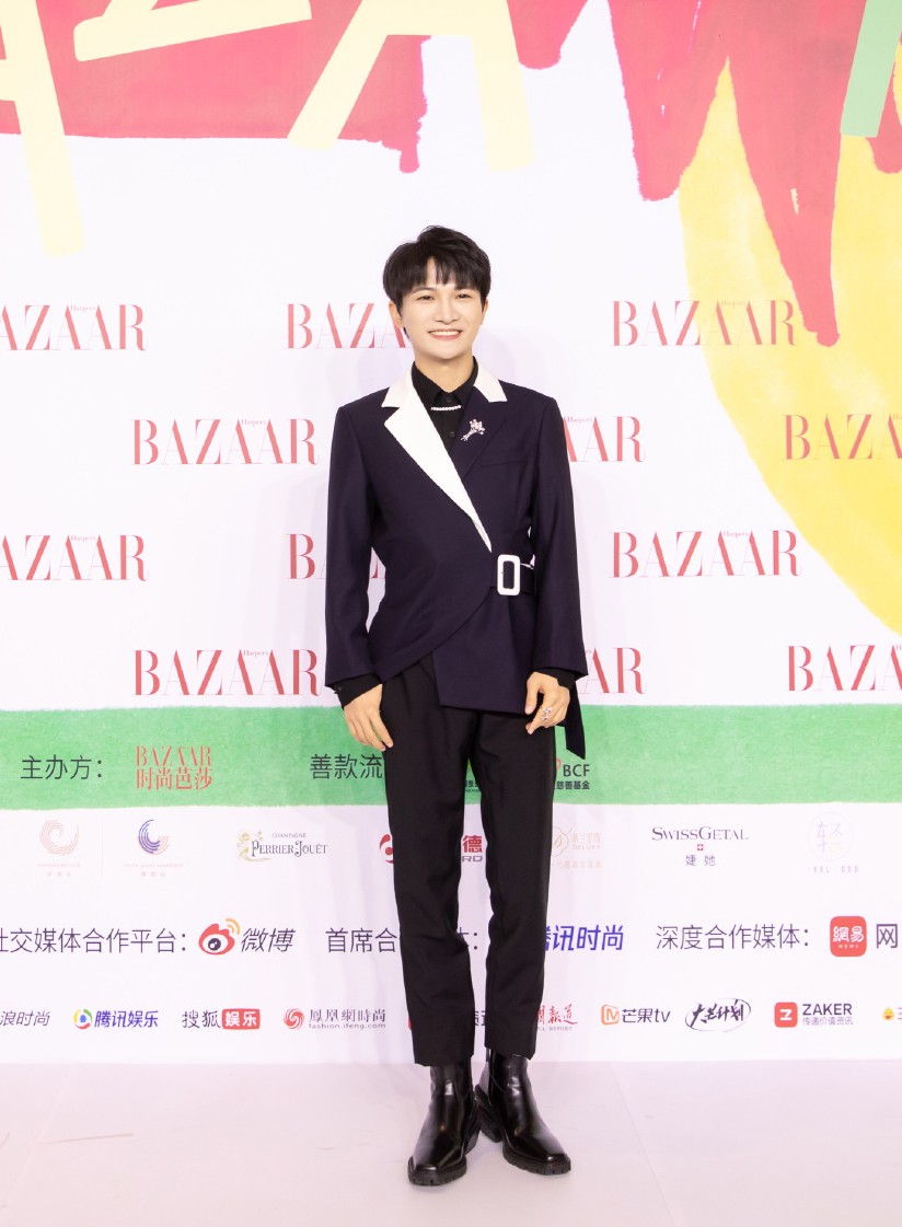 周深在選擇西裝上裝時,很少會利用「中規中矩」的版型和設計來呈現穿搭,總是會加入一些獨出機杼的小設計。短款西裝外套相較於常規版型更添幾分潮流風,而長飄帶設計也有助於帶來視覺延伸,對於小個子十分友好。