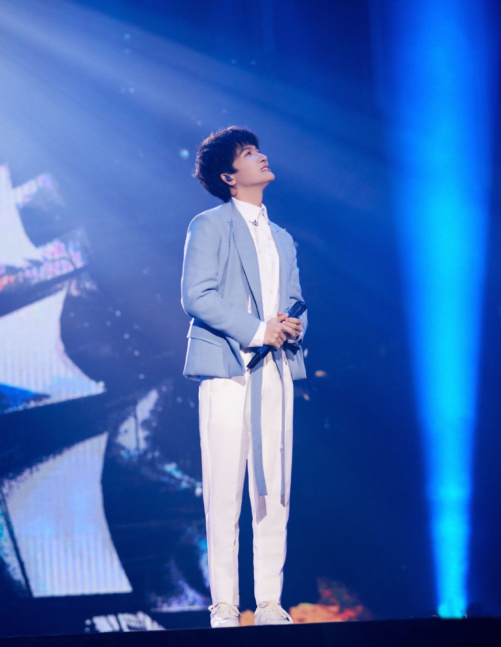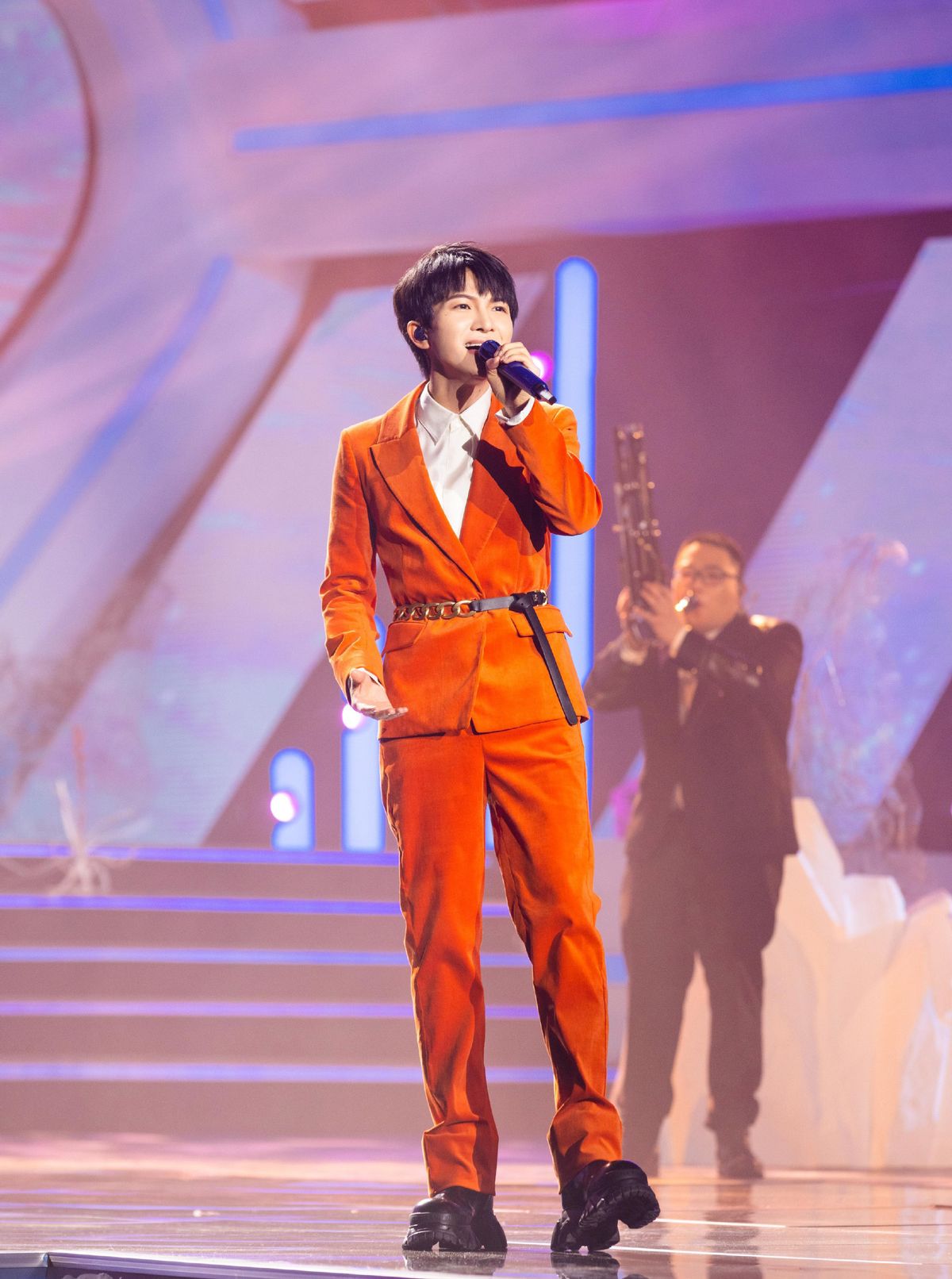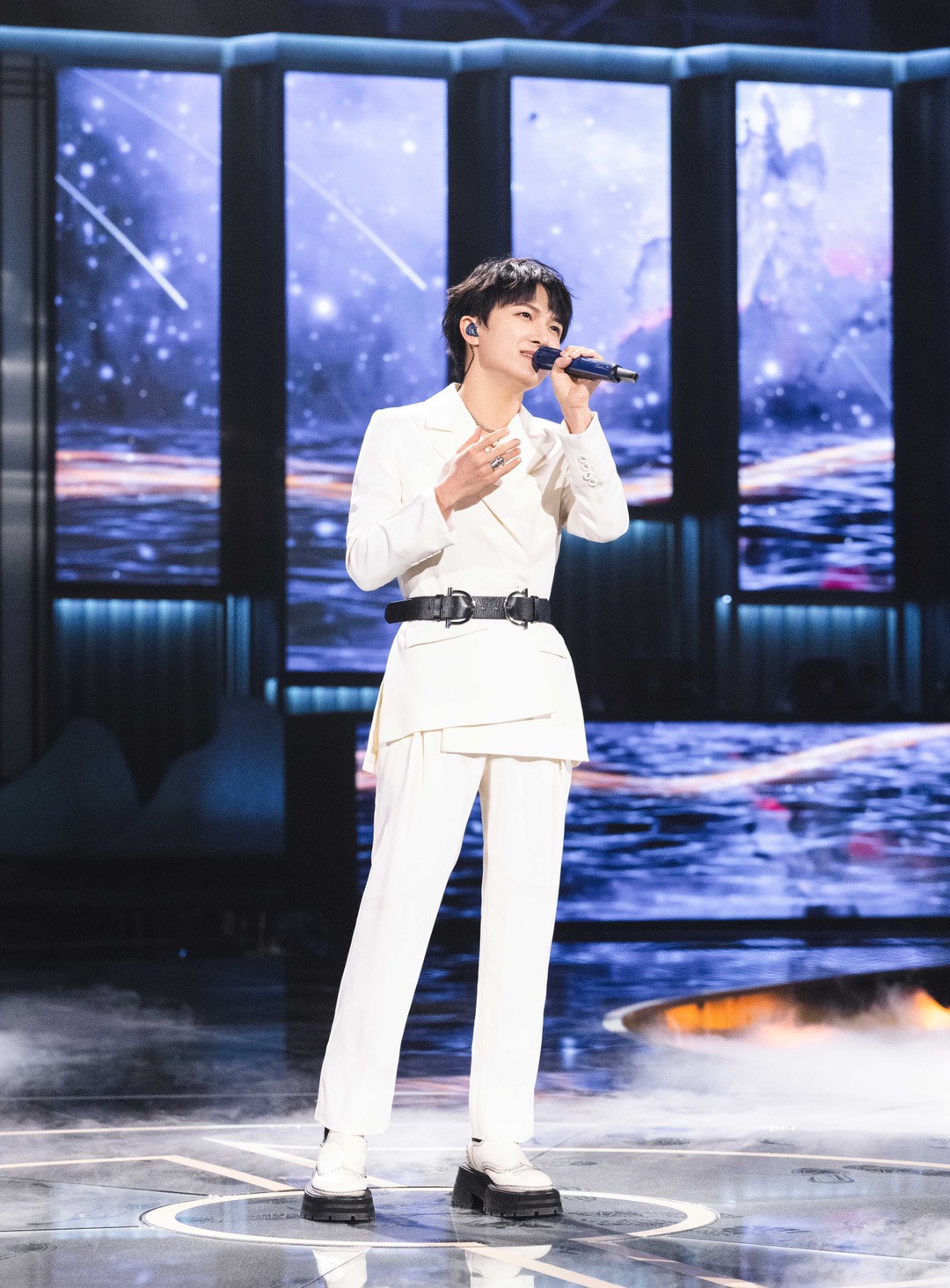 周深在選擇西裝上裝時,很少會利用「中規中矩」的版型和設計來呈現穿搭,總是會加入一些獨出機杼的小設計。短款西裝外套相較於常規版型更添幾分潮流風,而長飄帶設計也有助於帶來視覺延伸,對於小個子十分友好。