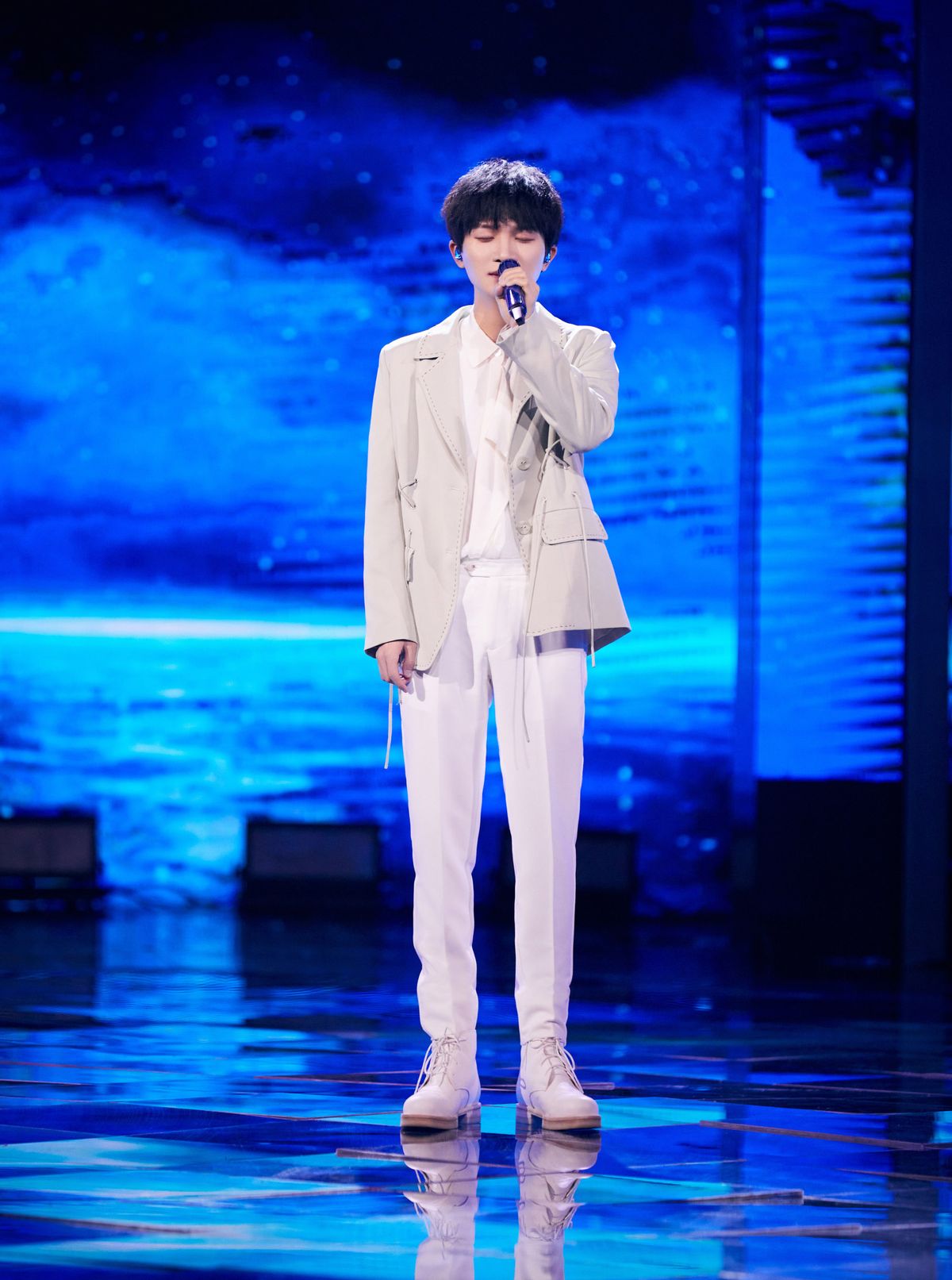 相比於深色西服套裝,淺色西裝所呈現出的潮流氣息會更勝一籌清新與淡雅的色調也更加適合小個子男士來選擇。周深選擇將淺色西服套裝結合基礎款白T塑造造型,為搭配略添幾分休閒風,絲毫不顯個子矮。