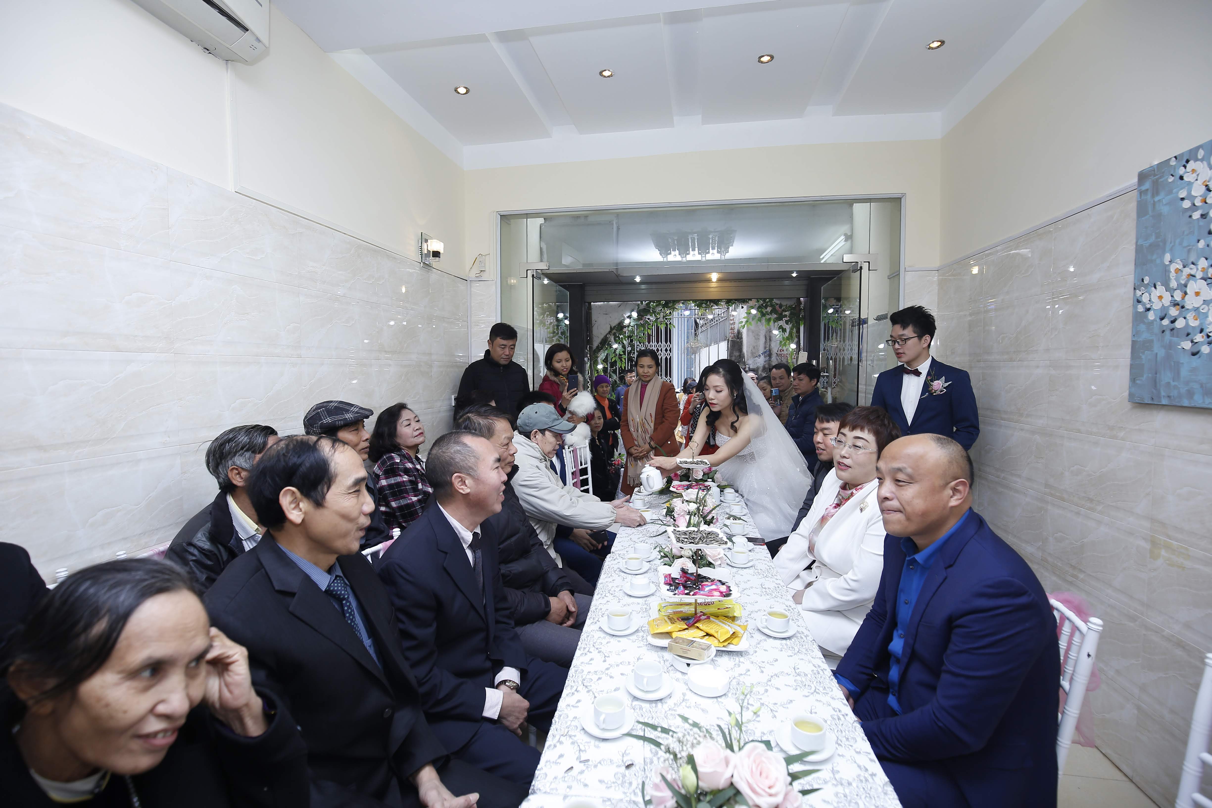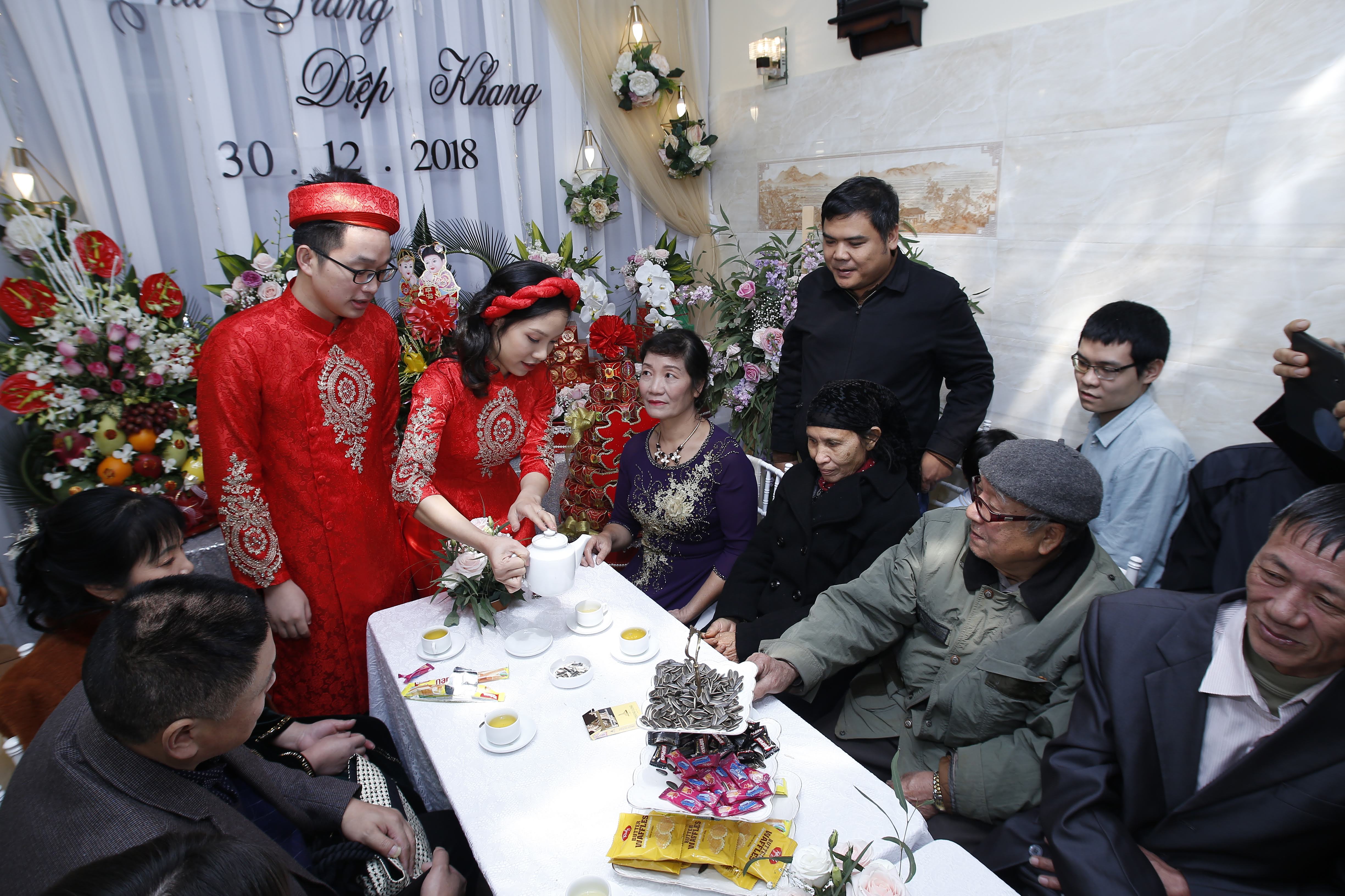 祭祀完祖先,新郎和新娘一起下樓,給今天來的賓客一一斟茶。