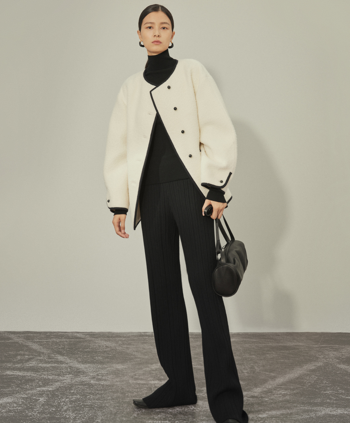 經典時尚的搭配方式,就是白色的小香風外套,搭配黑色高領打底衫,風格過於基礎,但是很適合日常來搭配。