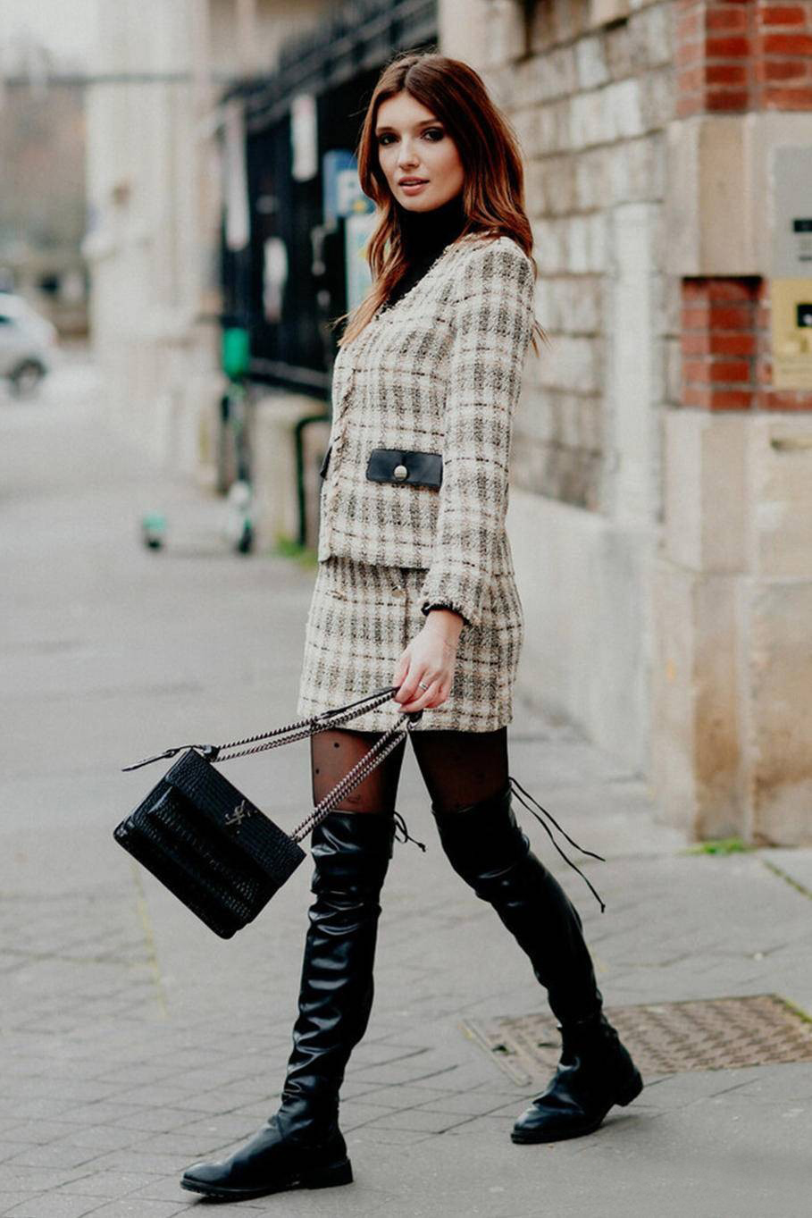 又或者最簡單的就是一身的小香風套裝,搭配黑色絲襪摩登感就會更明顯,配上一款手提包,還會讓整體風格看起來更加優雅大氣、不過這個穿法是講究越簡單越好,不要堆積太多的單品和元素,要不然會顯土氣。