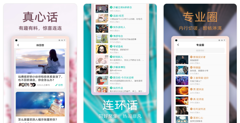 主打交友,玩法簡單,就真心話和連環話兩個模式。真心話是在回答話題後,系統綁定相似回答,適合認識志同道合的朋友。連環話是主題派對,有超級多的話題可以po文。它還有視訊功能,每天都有友友分享視訊,有表情包天地,我每天能存很多表情包,有好友有群聊,怎麼嘮嗑兒都行!