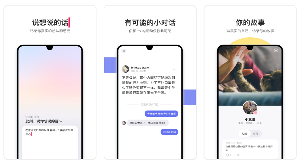 這款軟體最特別的地方在於它的匹配機制,取消了普通的內容廣場,通過內容匹配內容相遇,當你和一個人同時發布了相似的內容,你們就會匹配到一起,這種方式比較浪漫,可以用來找對象的同時也適合交友,同時對用戶的隱私有會所保護,遇到的用戶都不能偷偷關註你,單方面給你點亮,給你發消息,都不會留下痕跡,只有你和他們雙向聊天,或者加了好友,才能持續交流。