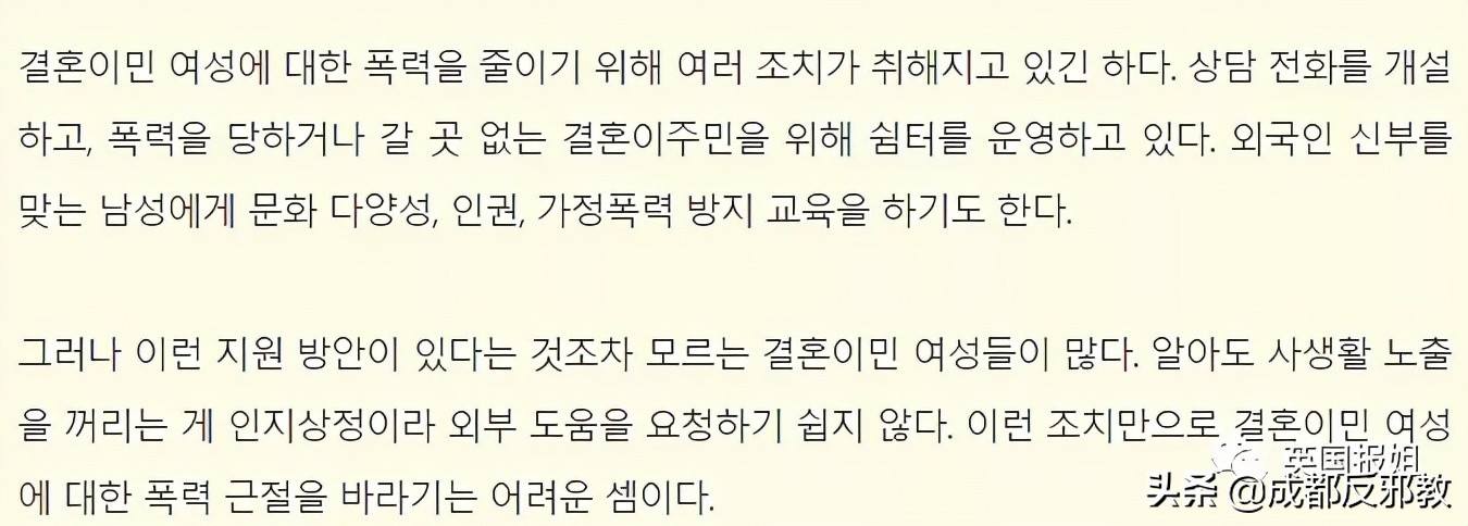 所以僅憑這些措施,不根除根深蒂固的歧視和制度問題,很難杜絕對外國妻子的暴力行為。