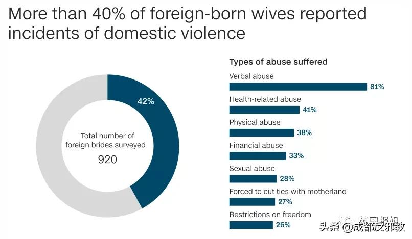 這個數字放在移民女性身上,飛漲成了42%,超過42%的外國妻子稱,她們都遭受過家庭暴力,包括身體、語言、性和經濟上的虐待。