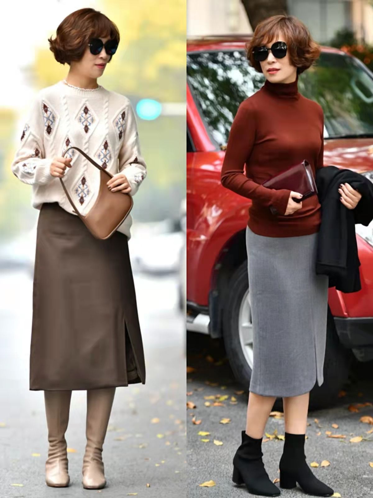 過膝裙+短靴的搭法不僅時尚實用,又可以滿足熟齡女生各種場合的穿搭需要,配大衣、毛衣好看時髦,喜歡的話不妨借鏡一下吧!